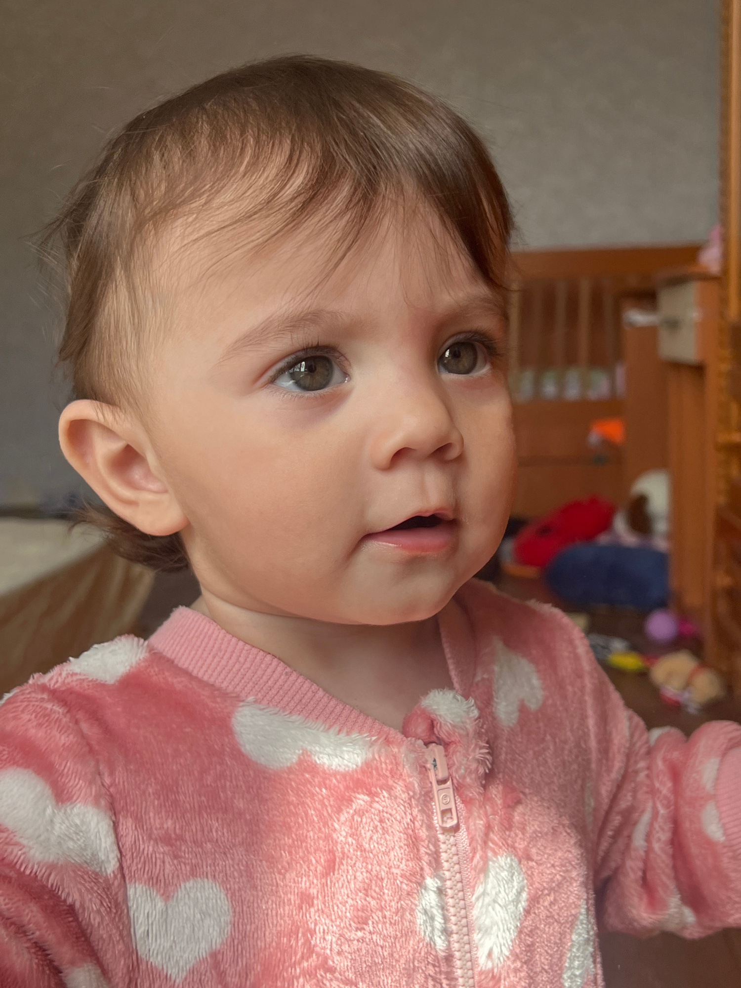 A close-up, tilted shot of a young child with brown hair and light skin, wearing a pink, plush onesie with white heart patterns, focusing on their face and upper body. The child's expression is slight…read more