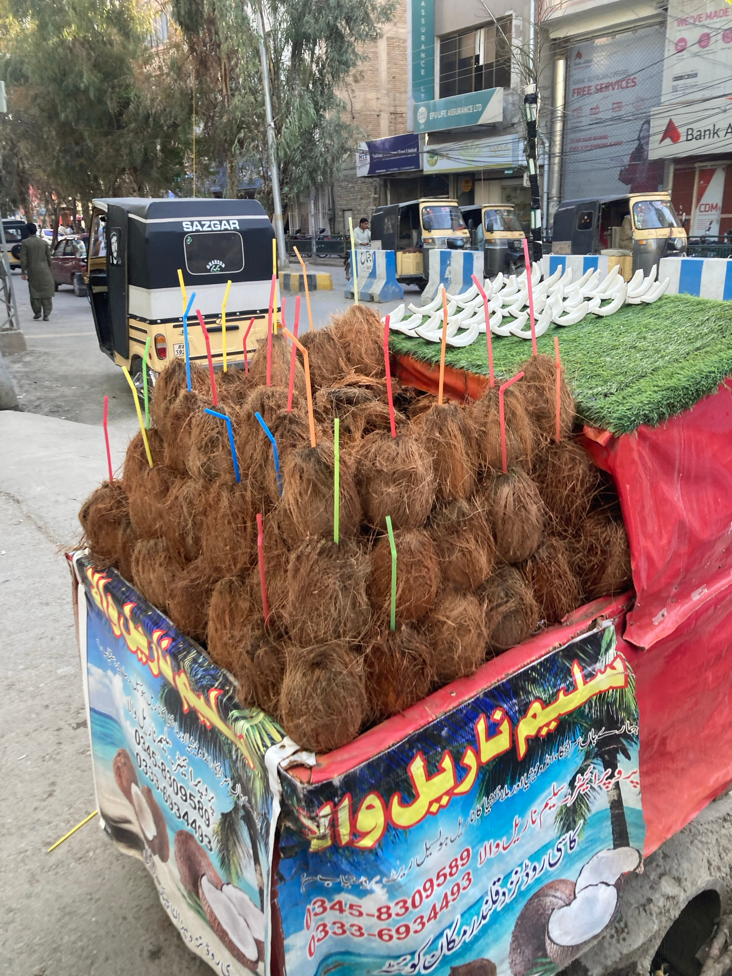 In the city of Quetta City Tehsil, Pakistan, the image features a street scene with a cart piled high with coconuts, each adorned with a colorful straw. The cart is positioned next to a three-wheeled…read more