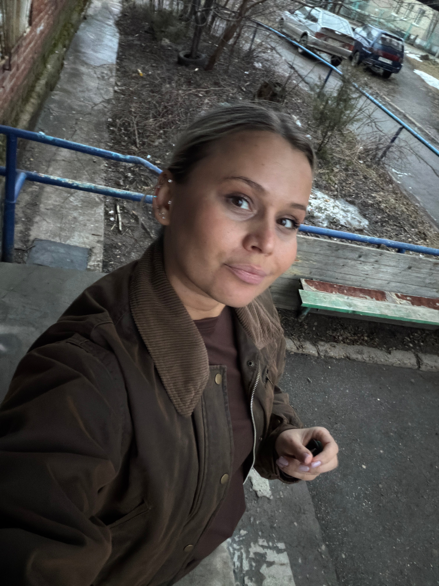 A woman with light brown hair and brown eyes is seen in a selfie. She's wearing a brown jacket with a corduroy collar and a brown shirt. Her nails are painted a light purple color. The background show…read more