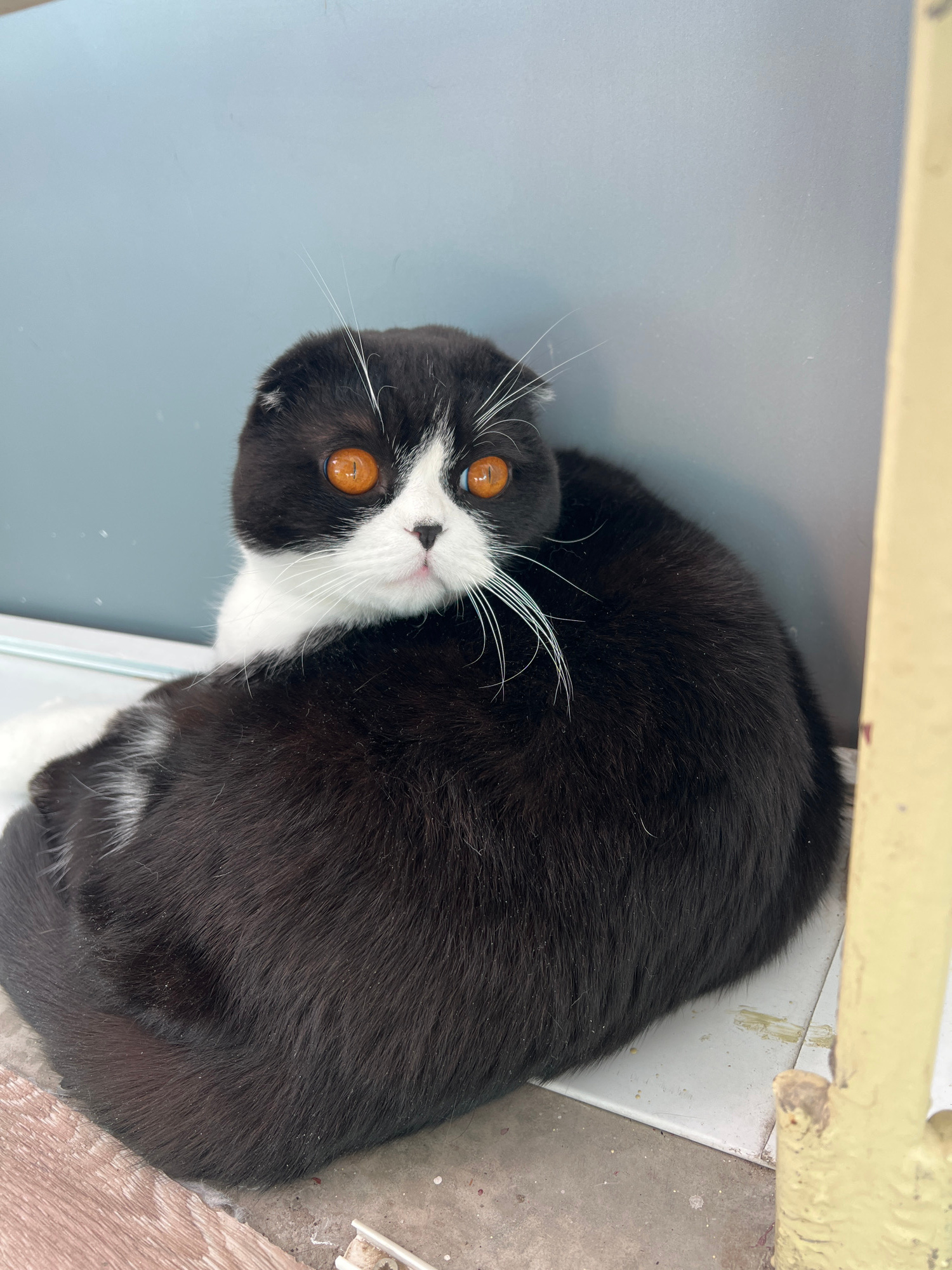 The image features a domestic cat, likely a Scottish Fold or a similar breed, captured in a close-up, eye-level perspective. The cat has striking black fur with prominent white markings on its face, c…read more