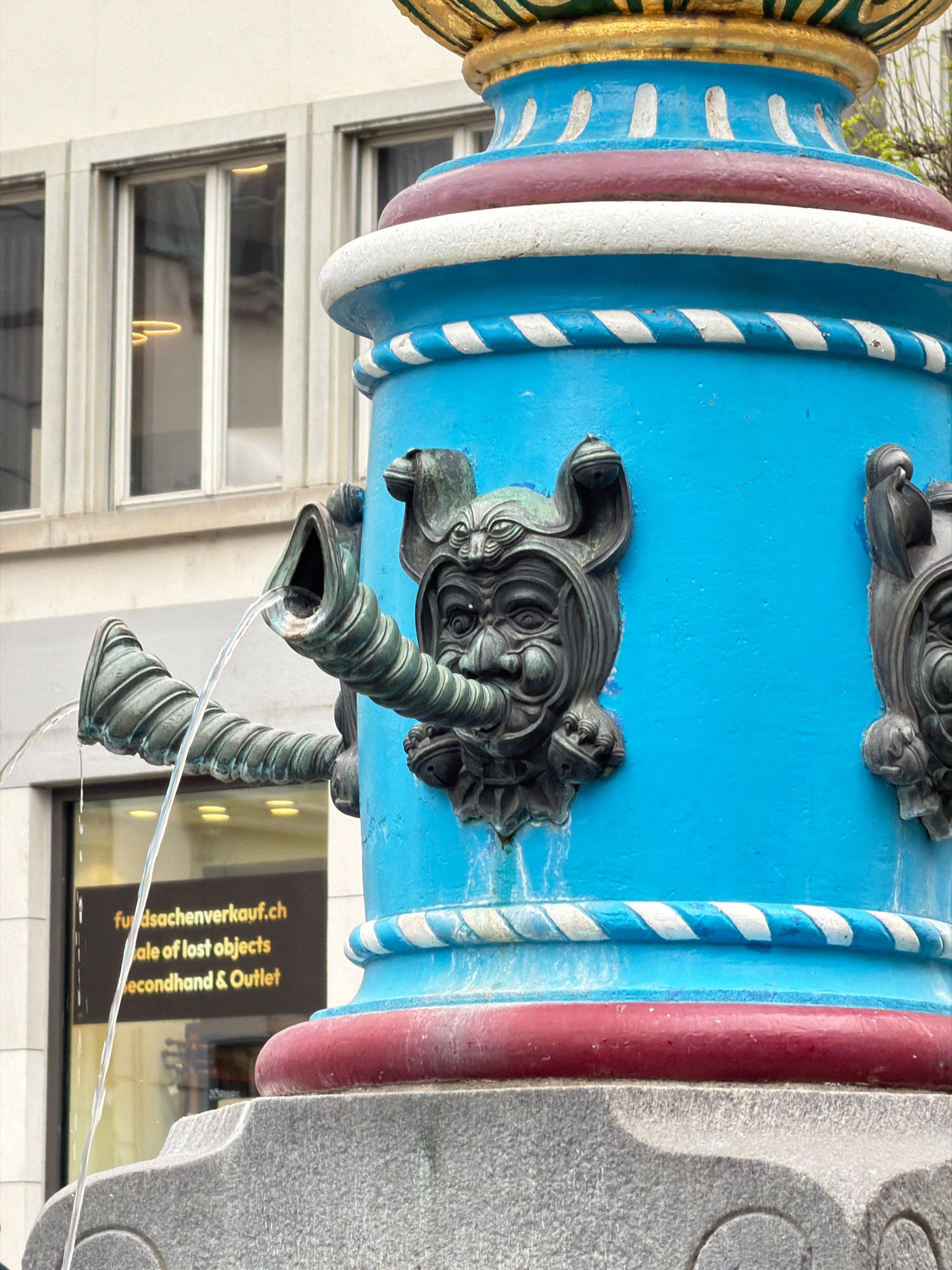 The image shows a section of a brightly colored fountain with water flowing from ornate metal spouts. The fountain has distinct blue, white, and red bands. The backdrop includes a building facade with…read more