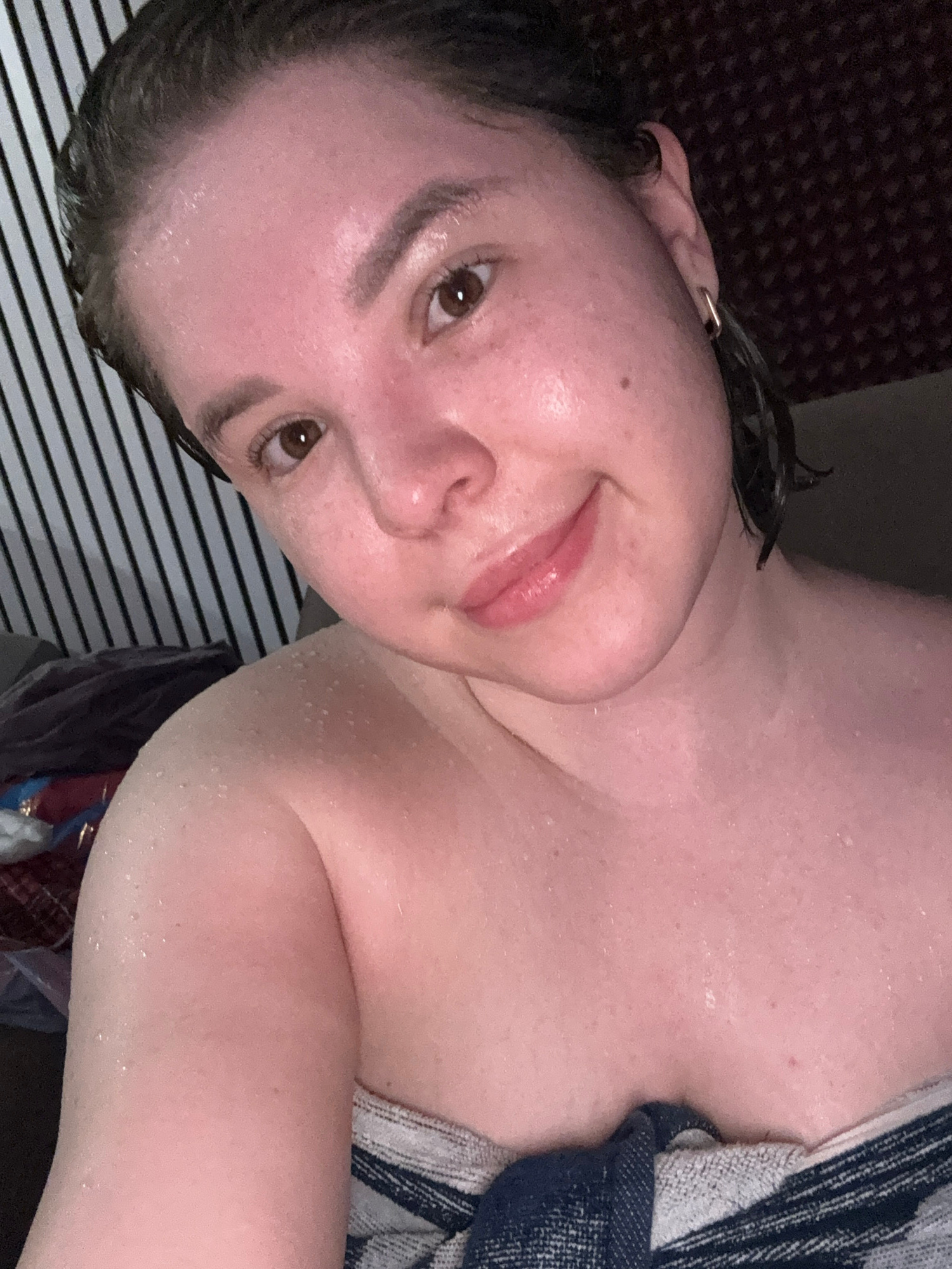 The image shows a close-up of a person's face and upper body, likely after a shower, judging by the water droplets on the skin and wet hair. The person has fair skin, brown eyes, and is partially wrap…read more