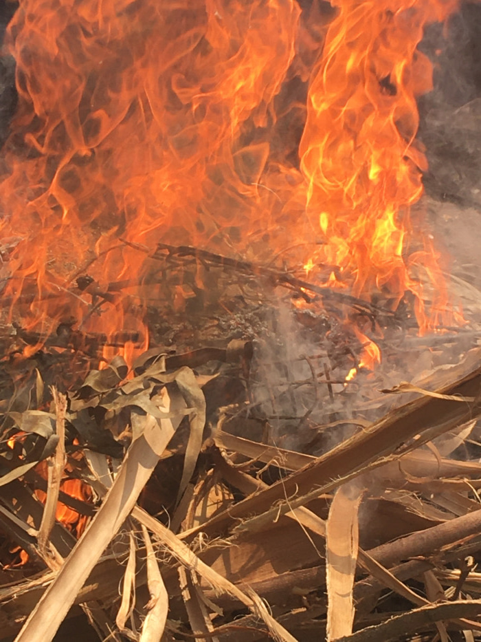 The image depicts a large, active fire consuming a pile of dry organic matter in Ndeiya, Kenya. Intense orange and yellow flames dominate the upper and central portions of the frame, exhibiting dynamiβ¦read more