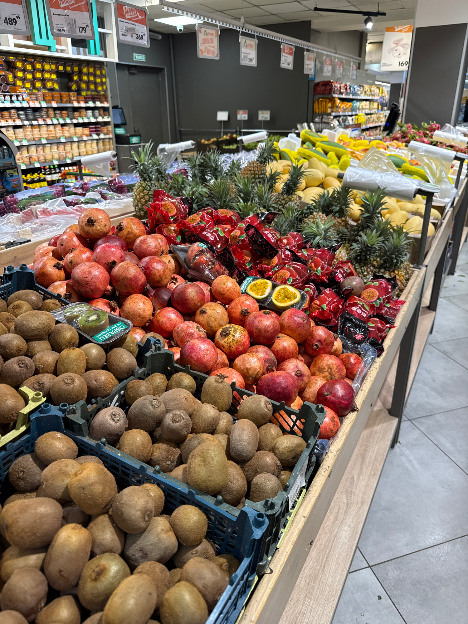 The image shows a fruit display in a supermarket aisle. The location is identified as Krasnoyarsk, Russia (based on Cyrillic text on price tags). The display features several varieties of fruit, arran…read more