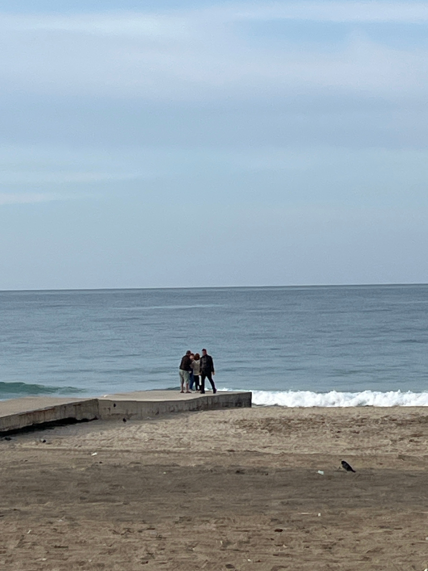 On a sunny day, an elevated, rotated, eye-level shot shows a scene on a coastal breakwater, likely in Alanya, Turkey. To the left, the sky is a muted, light blue, transitioning into the gray-blue ocea…read more
