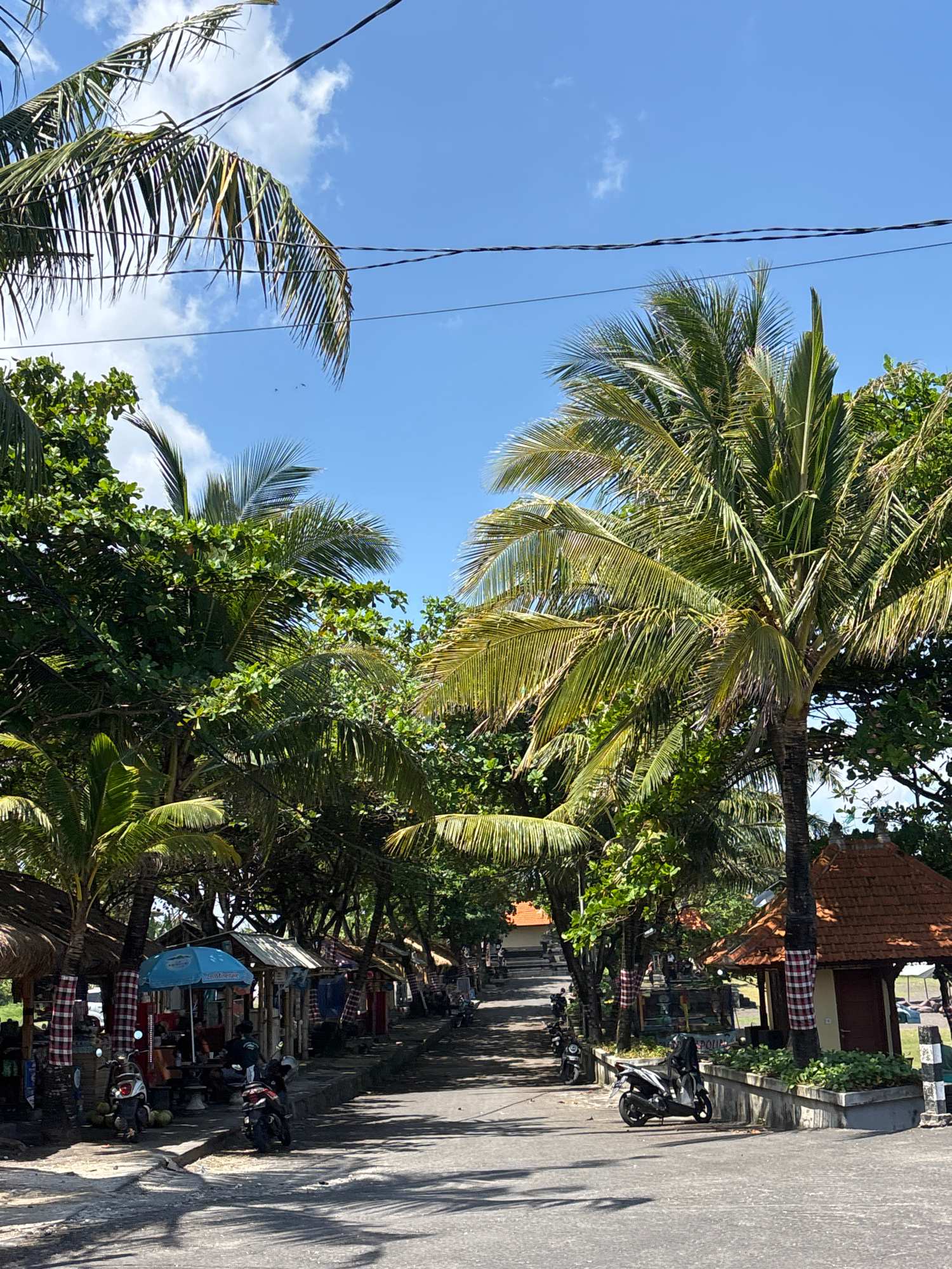The image depicts a street scene in Mengwi, Indonesia. Palm trees line the road, casting shadows on the pavement. Several scooters are parked along the side of the road. A building with a red tiled ro…read more