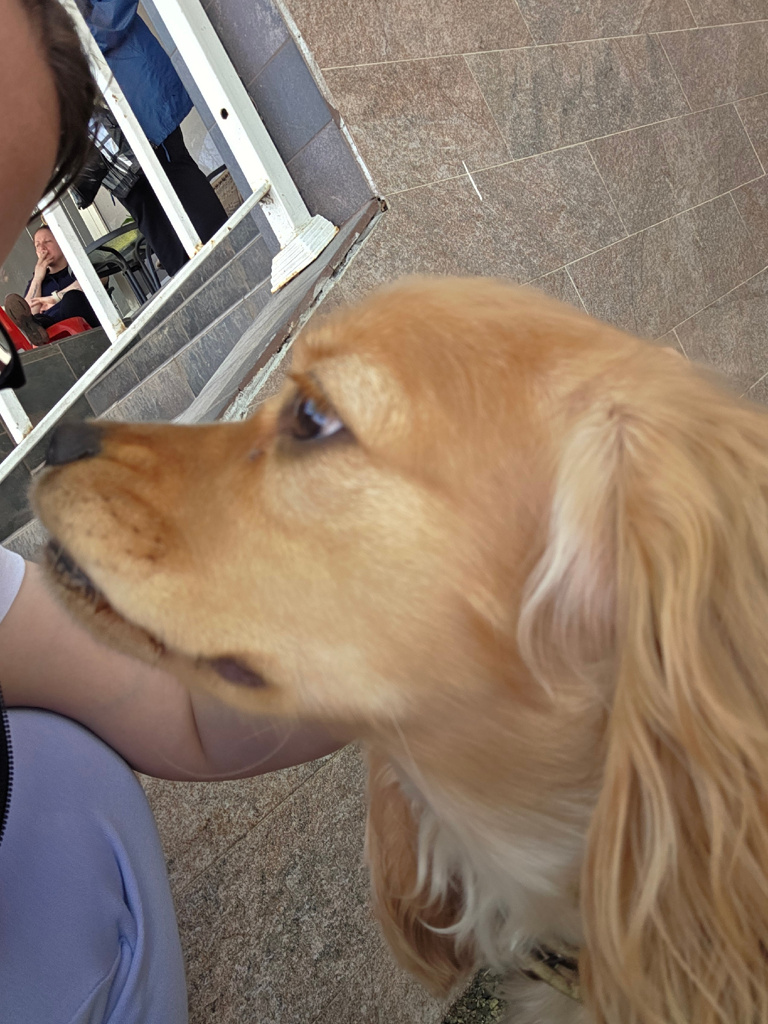 A close-up shot captures a golden retriever dog prominently in the foreground, looking upwards with an attentive gaze. Its golden-brown fur is visible, with hints of its nose and eyes. Part of a persoβ¦read more