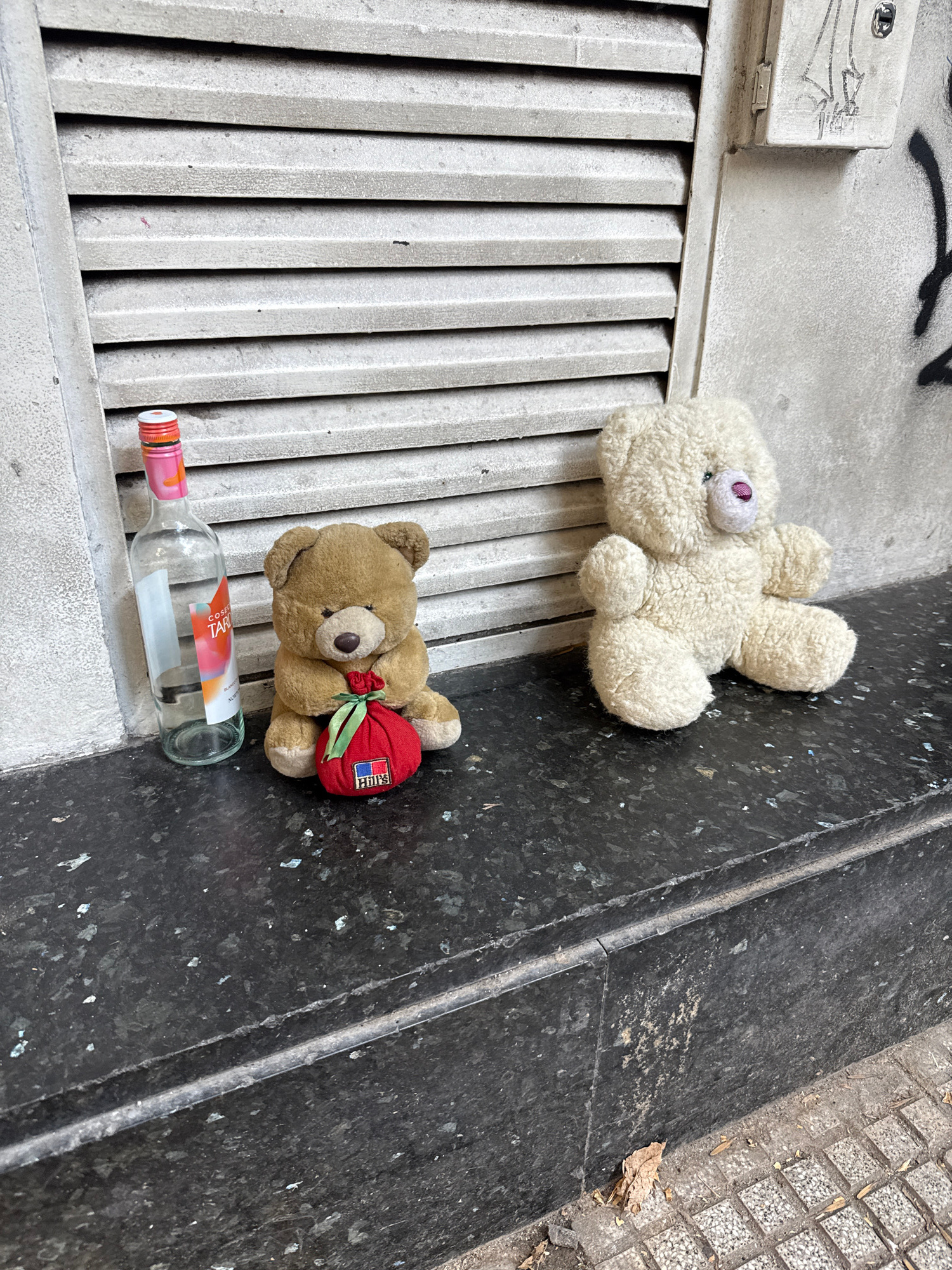 The image captures a scene on a Buenos Aires street. A white stuffed rabbit with one purple eye lies on a gray-painted metal grate, likely a ventilation cover or part of street infrastructure. Nearby,…read more