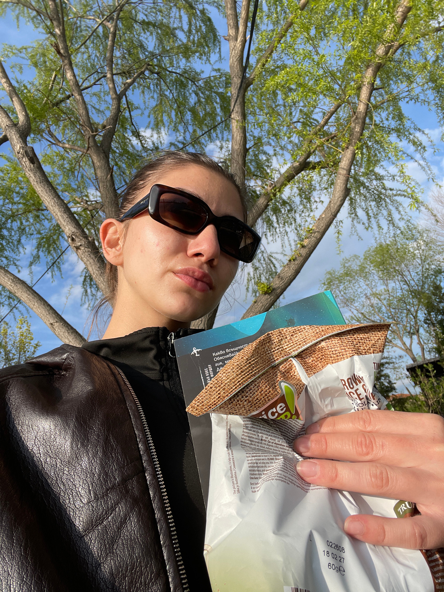 A low-angle shot captures a woman with sunglasses and a dark brown leather jacket in an outdoor setting. She is holding a half-open bag of chips. In the background, a tree with sparse green leaves aga…read more
