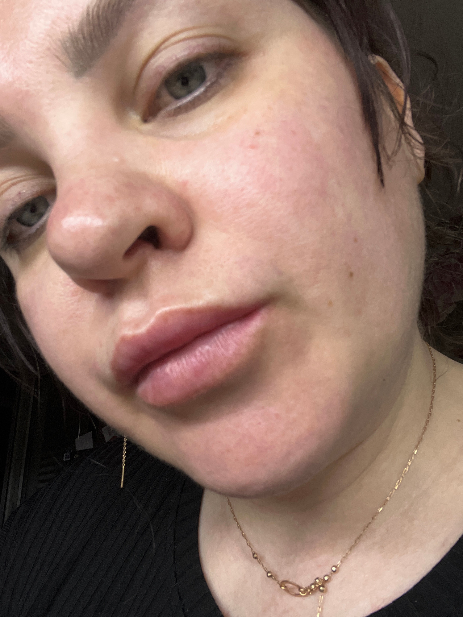 The image presents a detailed, close-up view of an adult female's face and upper chest, situated in the city of Noviy, Russia. Her fair skin shows localized redness on the cheeks and around the nasal…read more