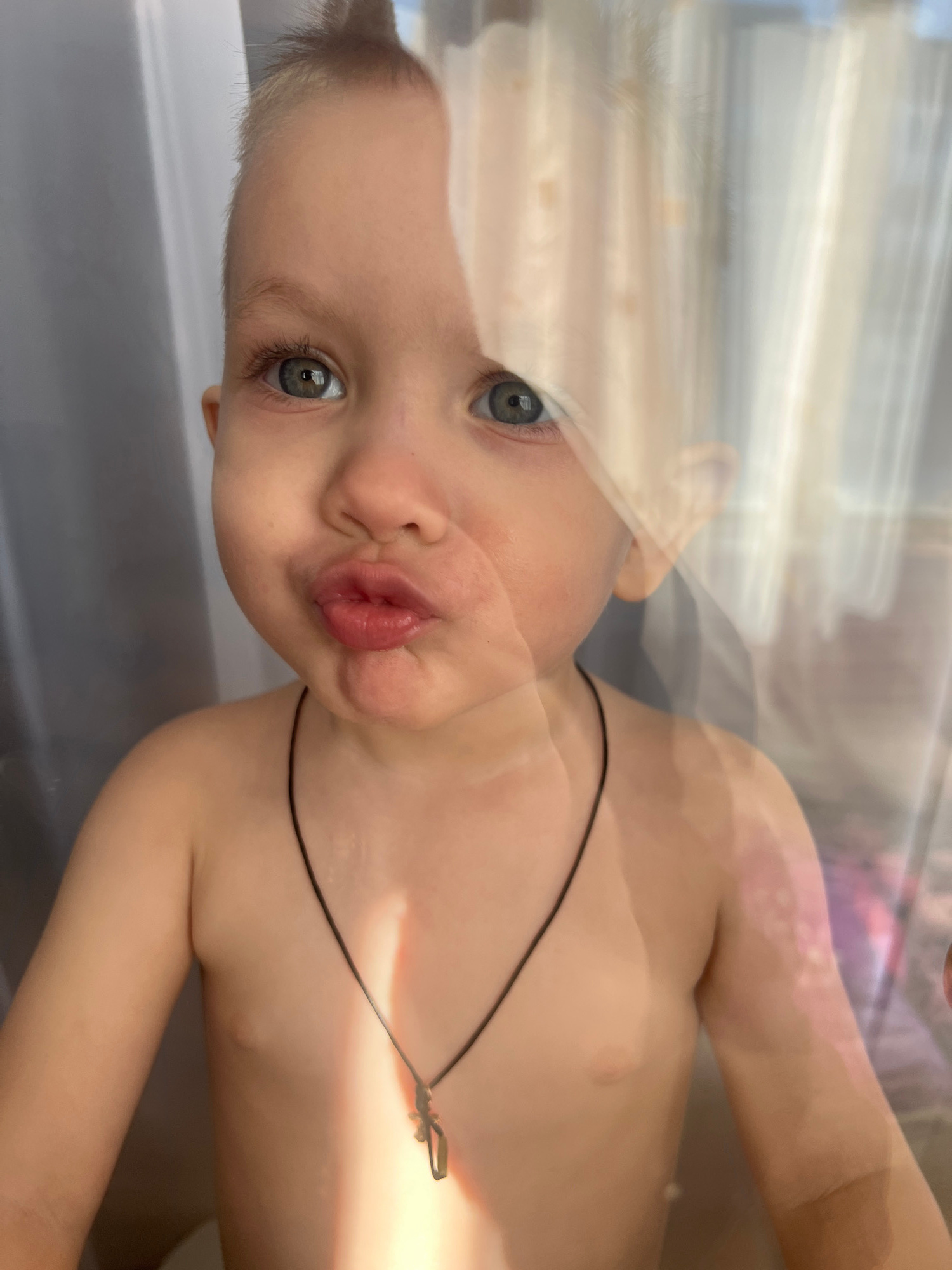 A young child is depicted in a close-up, slightly tilted perspective. The child has fair skin, light-colored hair, and grey eyes. The child is wearing a thin black necklace with a small pendant. The b…read more