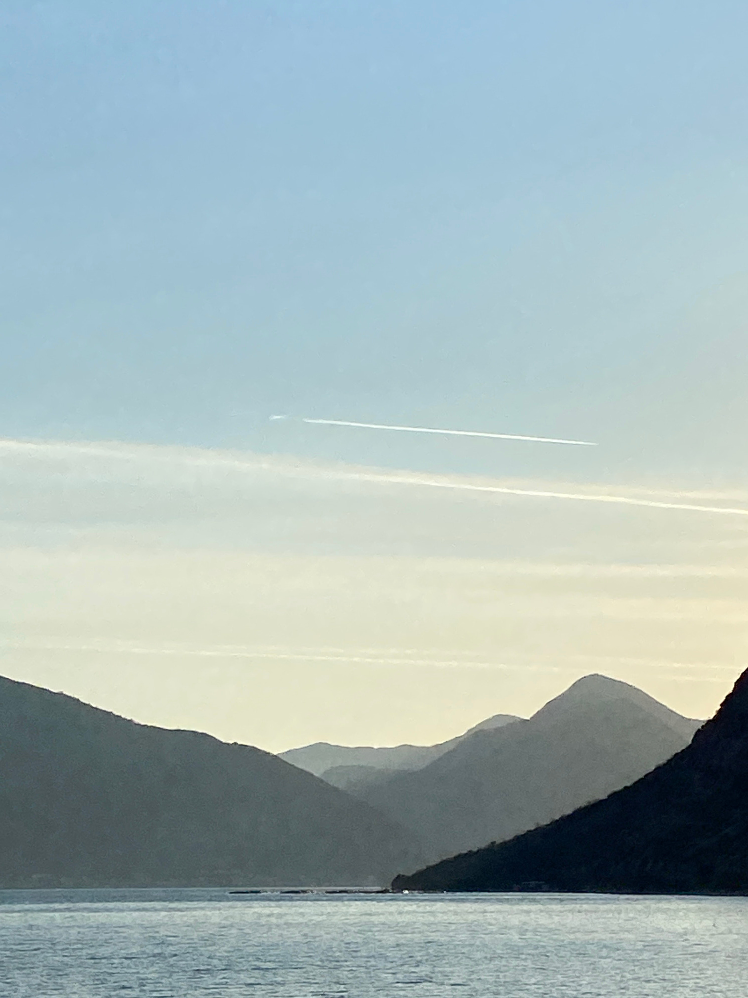 From Donji Orahovac, Montenegro, the image captures a view of layered mountains under a light sky. A vapor trail cuts vertically through the sky. A vertical wooden post is visible on the right side of…read more