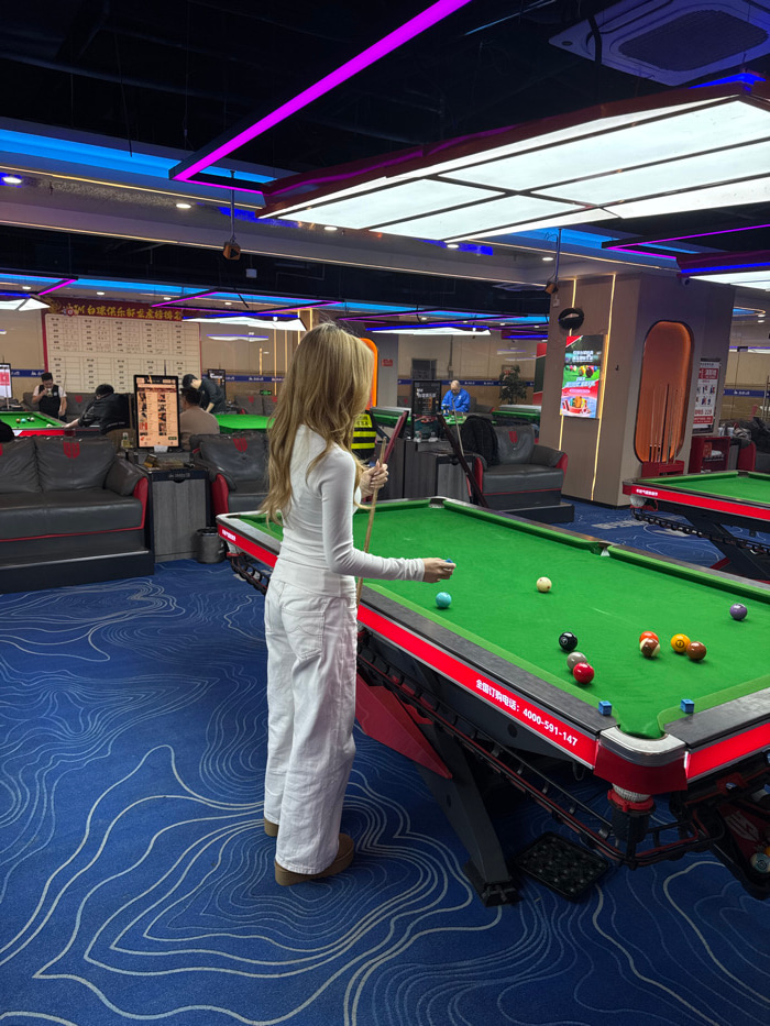 A woman in white plays pool in a brightly lit game room. The room features blue patterned carpeting and multiple pool tables. Other people are seated at gaming stations with monitors visible in the ba…read more