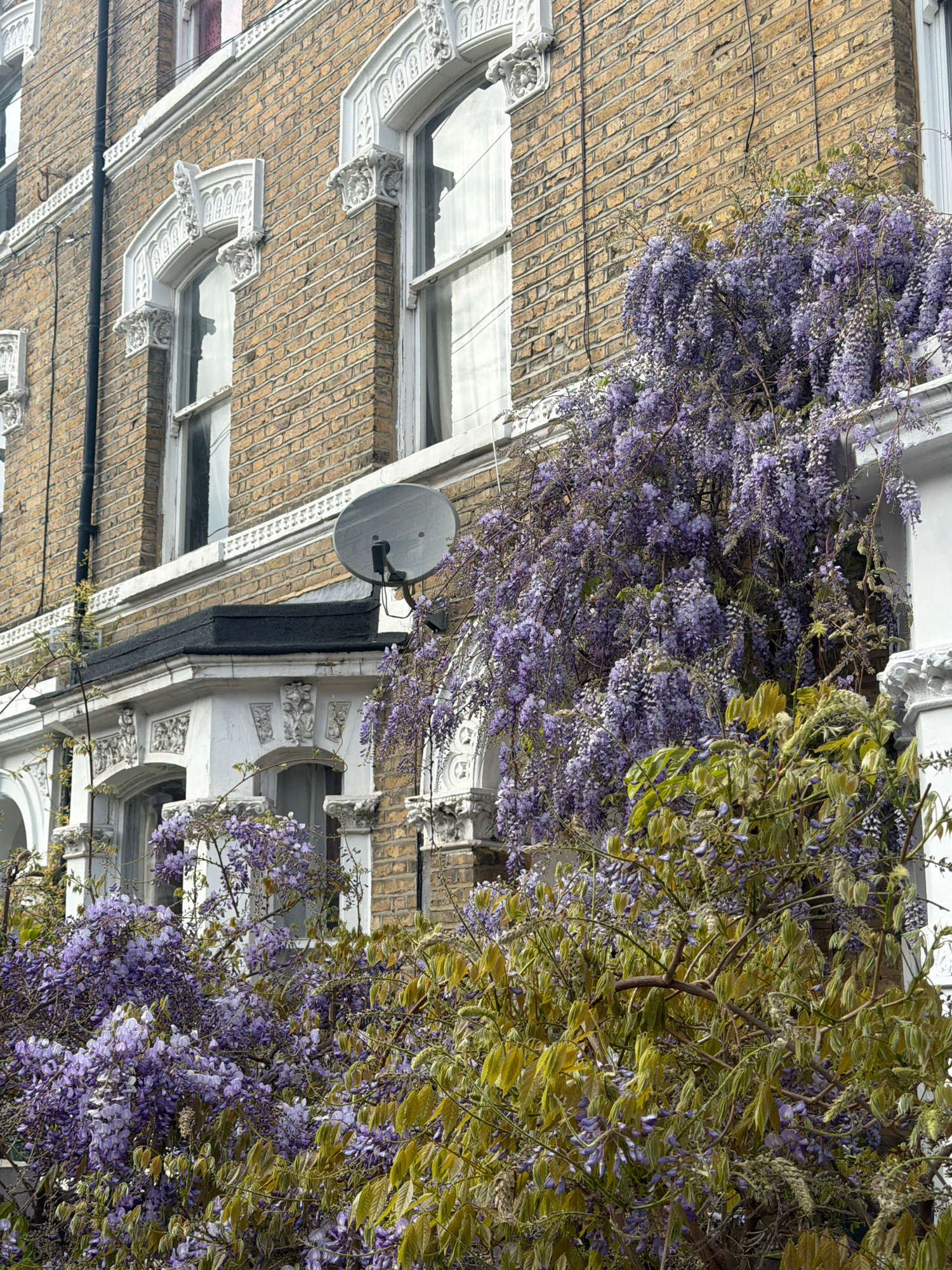 The image depicts the exterior of a building, likely a row house, in London, United Kingdom. The building has a brick facade and decorative white trim around the windows and along the roofline. A sate…read more