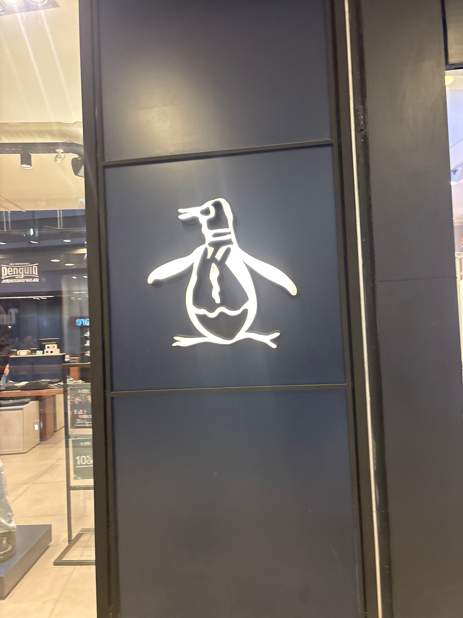 The image shows a sign of a penguin on the facade of a store. In the reflection, the word "Penguin" can be seen along with the words "Menswear." The sign appears to be illuminated with a white light.…read more