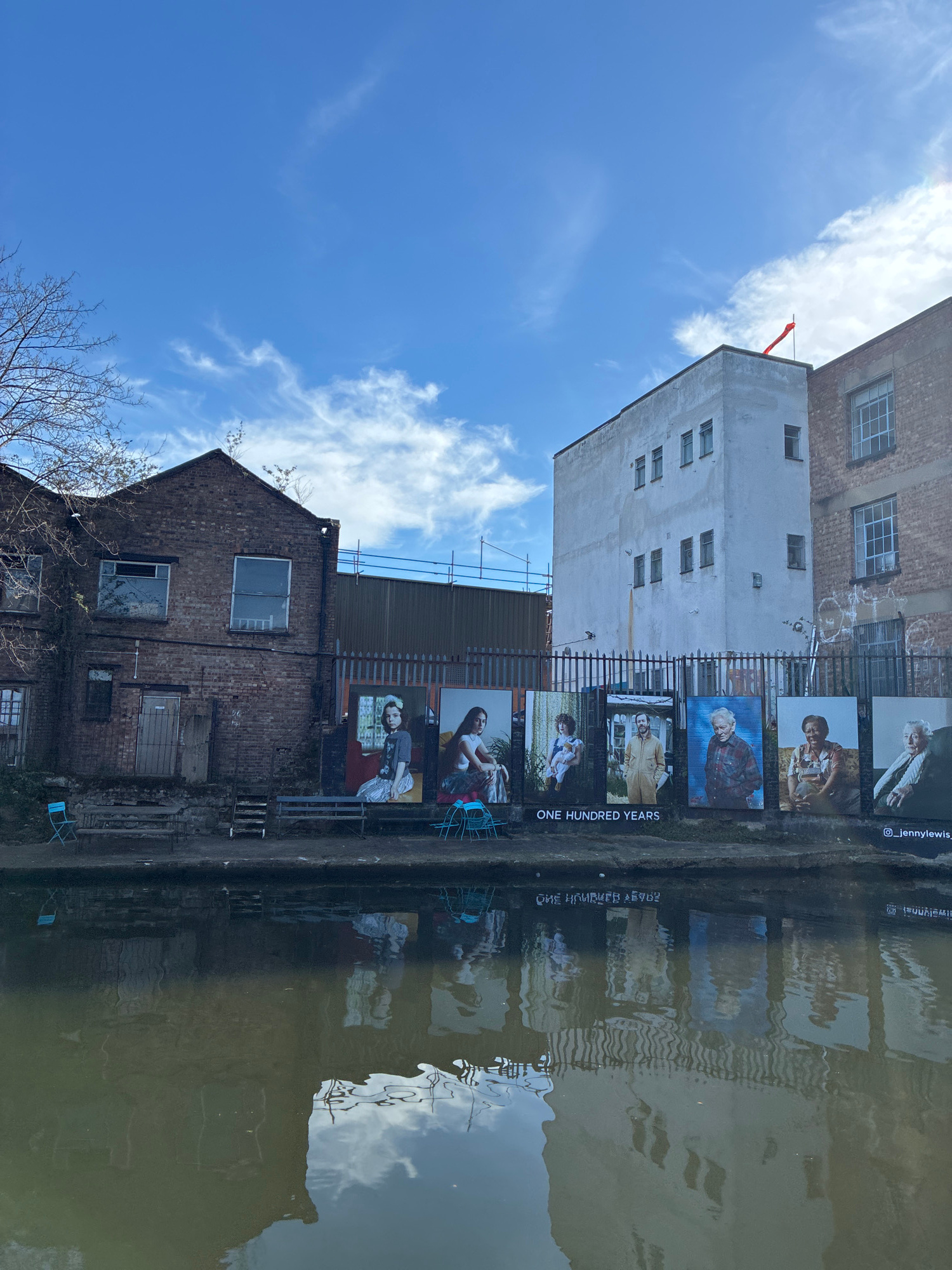 A canal scene in London, United Kingdom features reflections of brick and concrete buildings in the water. Along the canal-side, a series of posters with portraits of people are displayed, one titled…read more