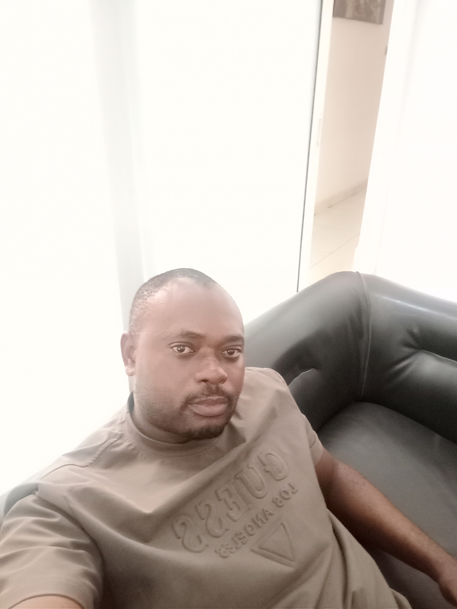 A medium shot depicts a man with short hair, a mustache, and a goatee, seated on a black leather couch in what appears to be an interior space. He is wearing a short-sleeved t-shirt with the "Guess" l…read more