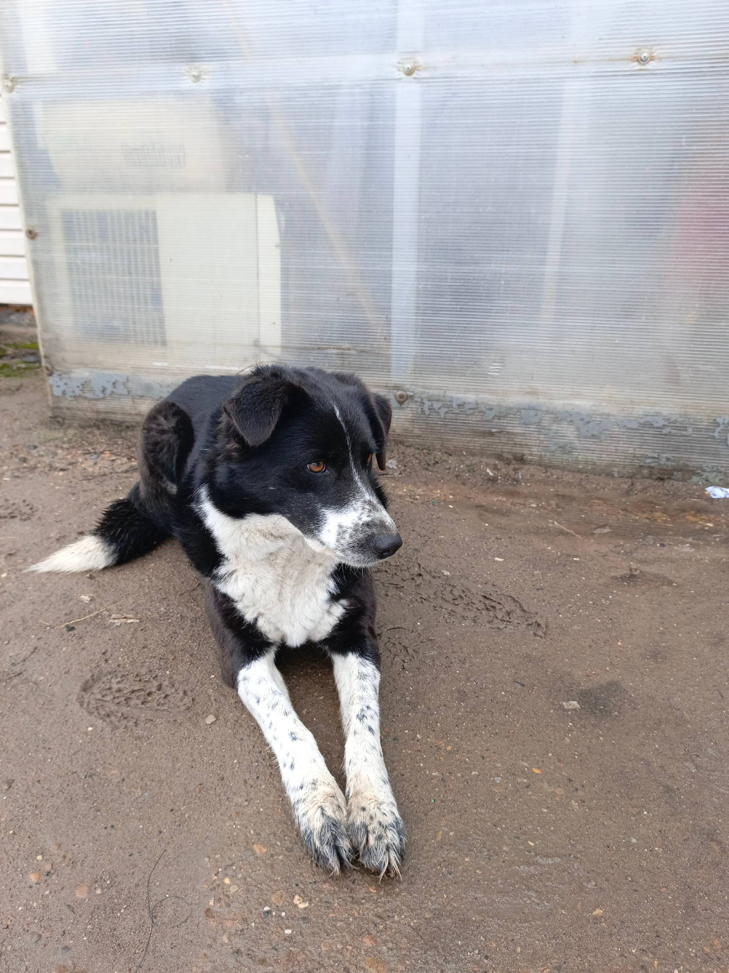A medium-sized black and white dog with speckled paws lies on the ground. The ground is dirt with small rocks. Behind the dog is a semi-transparent corrugated wall with a white air conditioning unit v…read more