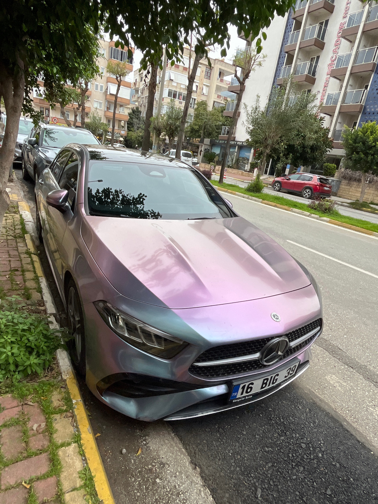 A Mercedes-Benz sedan, featuring an iridescent paint wrap that shifts from pink/purple to blue/teal, is parked curb-side on a paved street in Alanya, Turkey. The vehicle's front is oriented towards th…read more