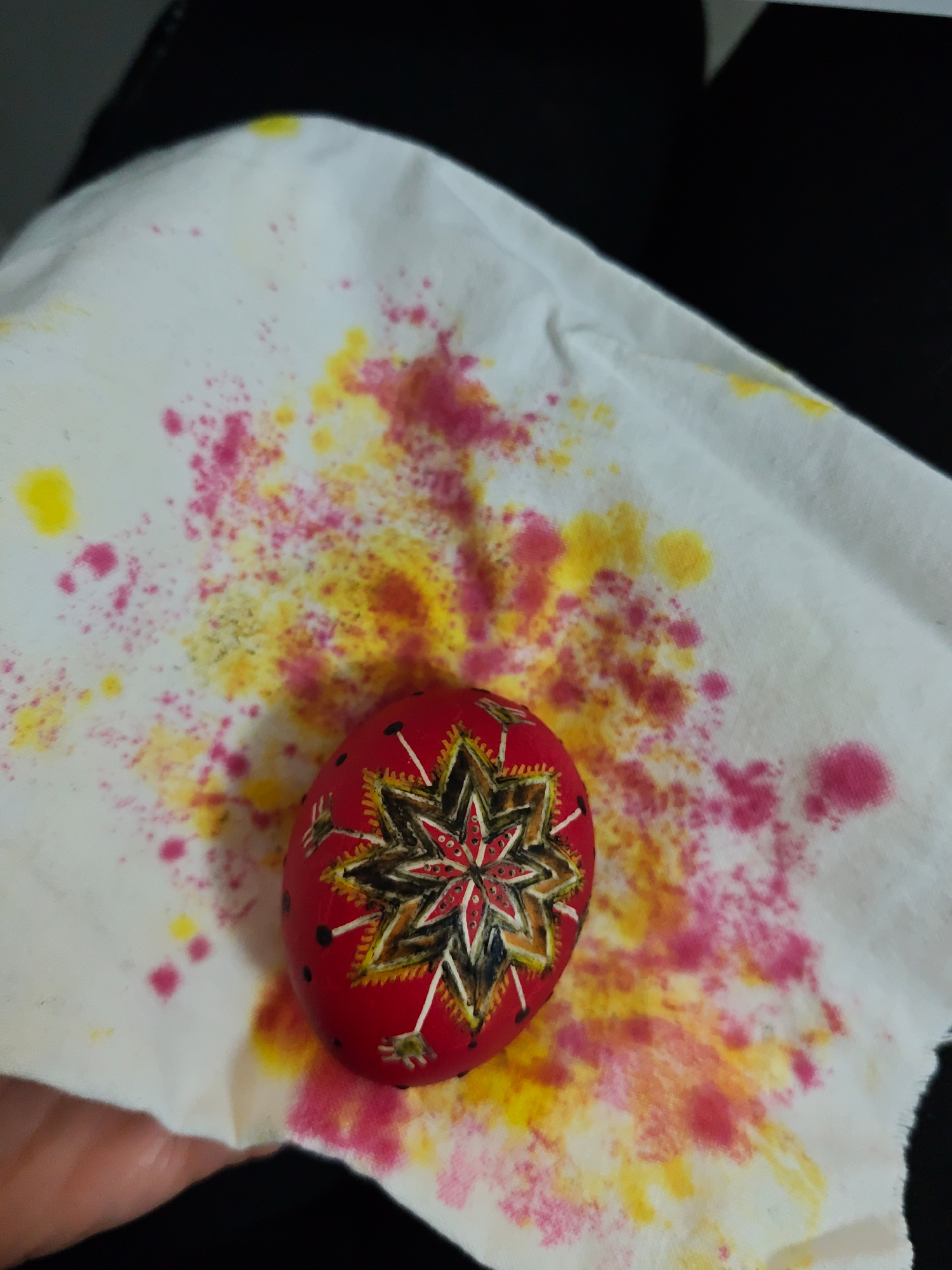 A close-up shot shows a red Pysanka egg with a starburst design resting on a white cloth that is stained with pink and yellow dye. The egg has intricate patterns etched or painted on it, with black ou…read more