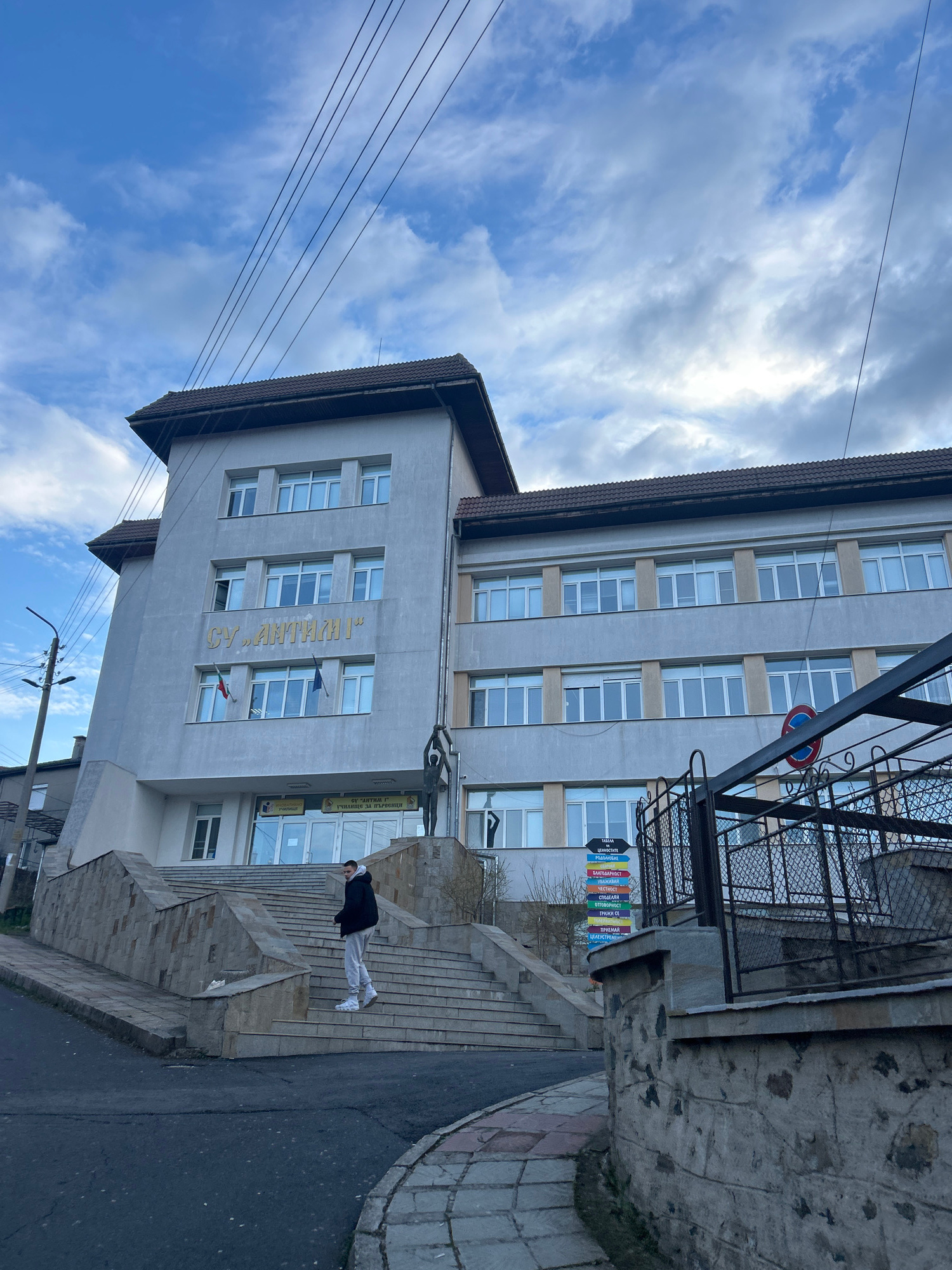 The image shows the façade of a building with multiple windows and a sign in Cyrillic script, identified as "СУ Антим I", possibly a school or educational institution. Two small flags, possibly Bulgar…read more