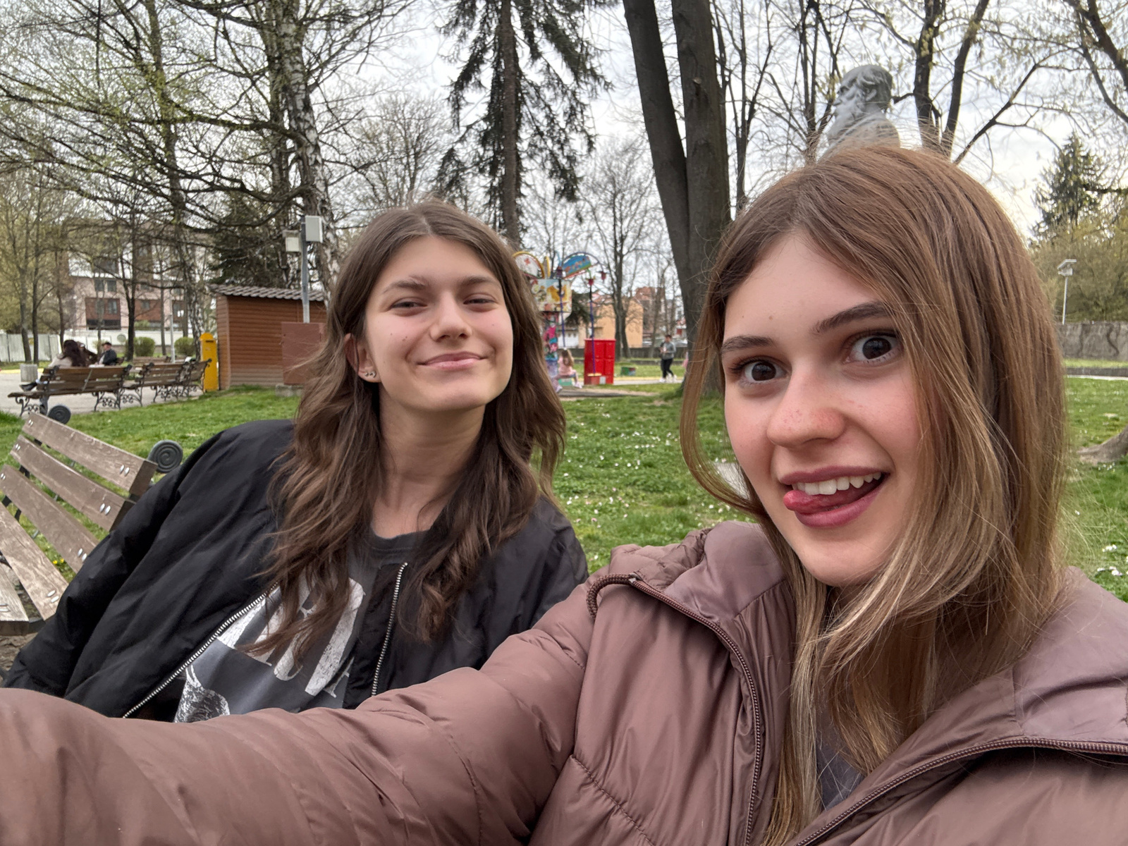 Two young women are captured in a close-up selfie or portrait in an outdoor setting in Panagyurishte, Bulgaria. The woman on the left has medium-length, light brown hair and is wearing a brown puffer…read more