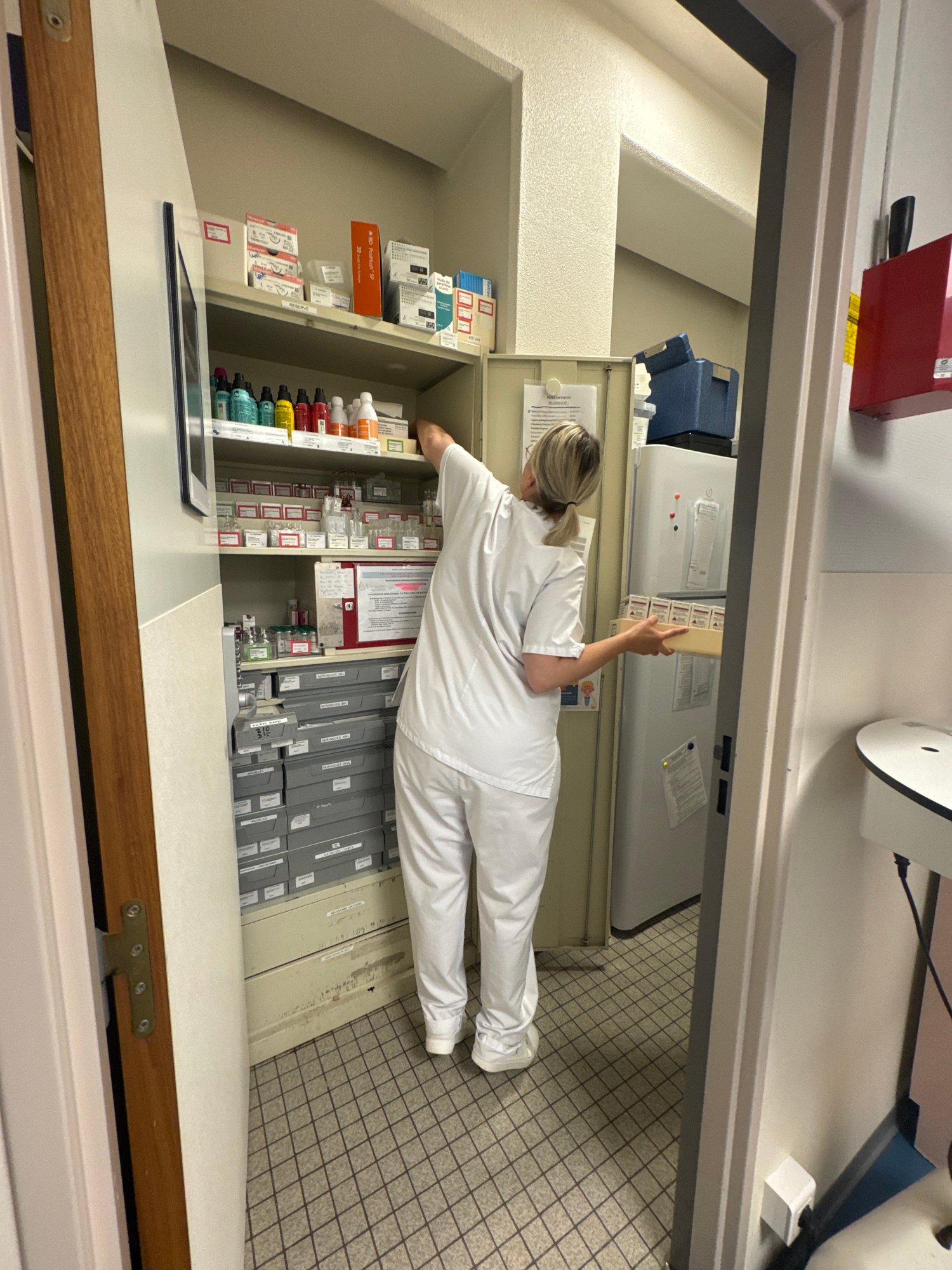 A female medical professional is actively working in what appears to be a hospital pharmacy or medication preparation room in Tourcoing, France. The scene shows her standing upright, clad in a white m…read more