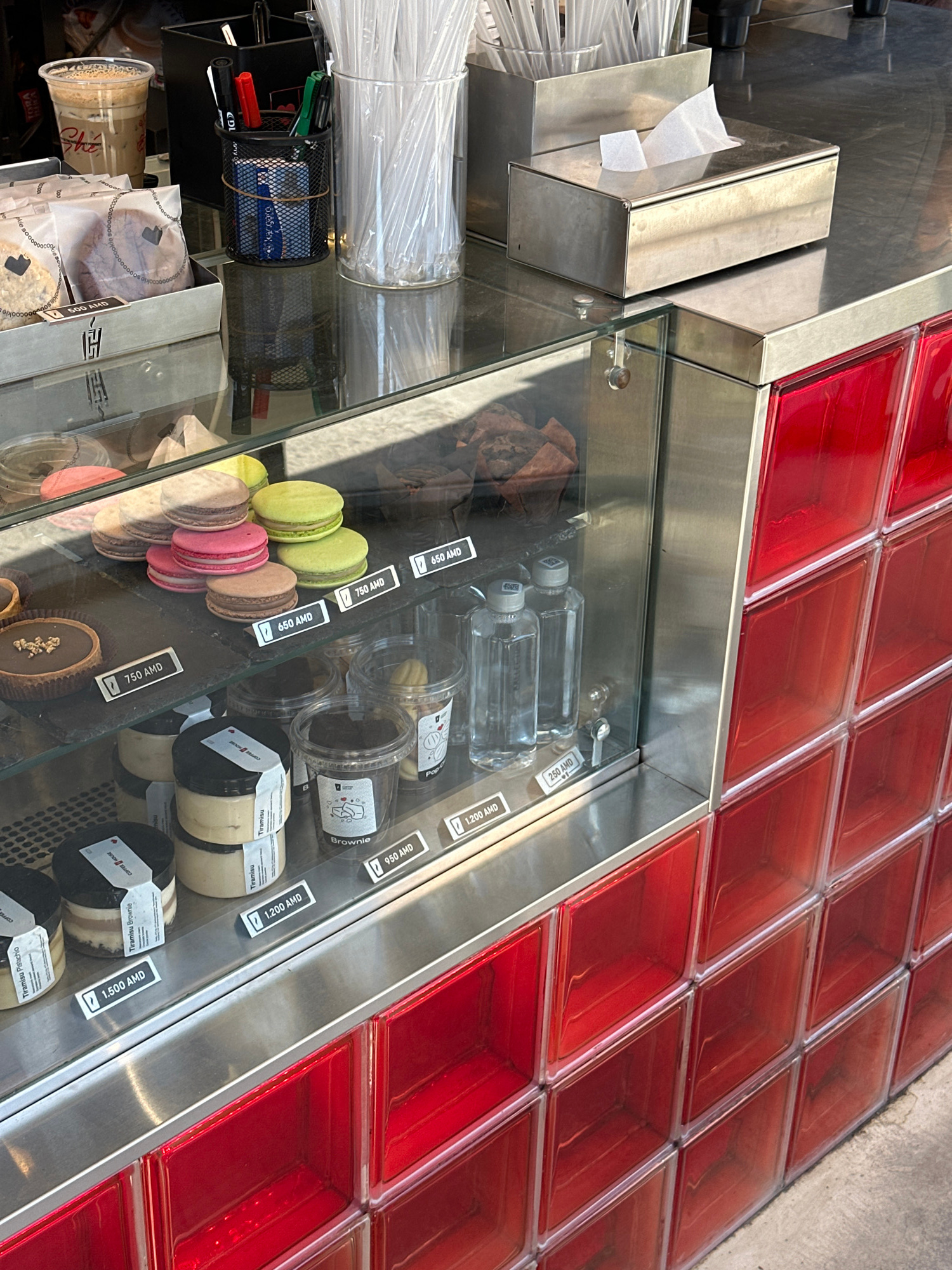 This image captures a vibrant display counter at what appears to be a cafe or dessert shop in Yerevan, Armenia. The scene is dominated by a stainless steel and glass display case, presenting an array…read more