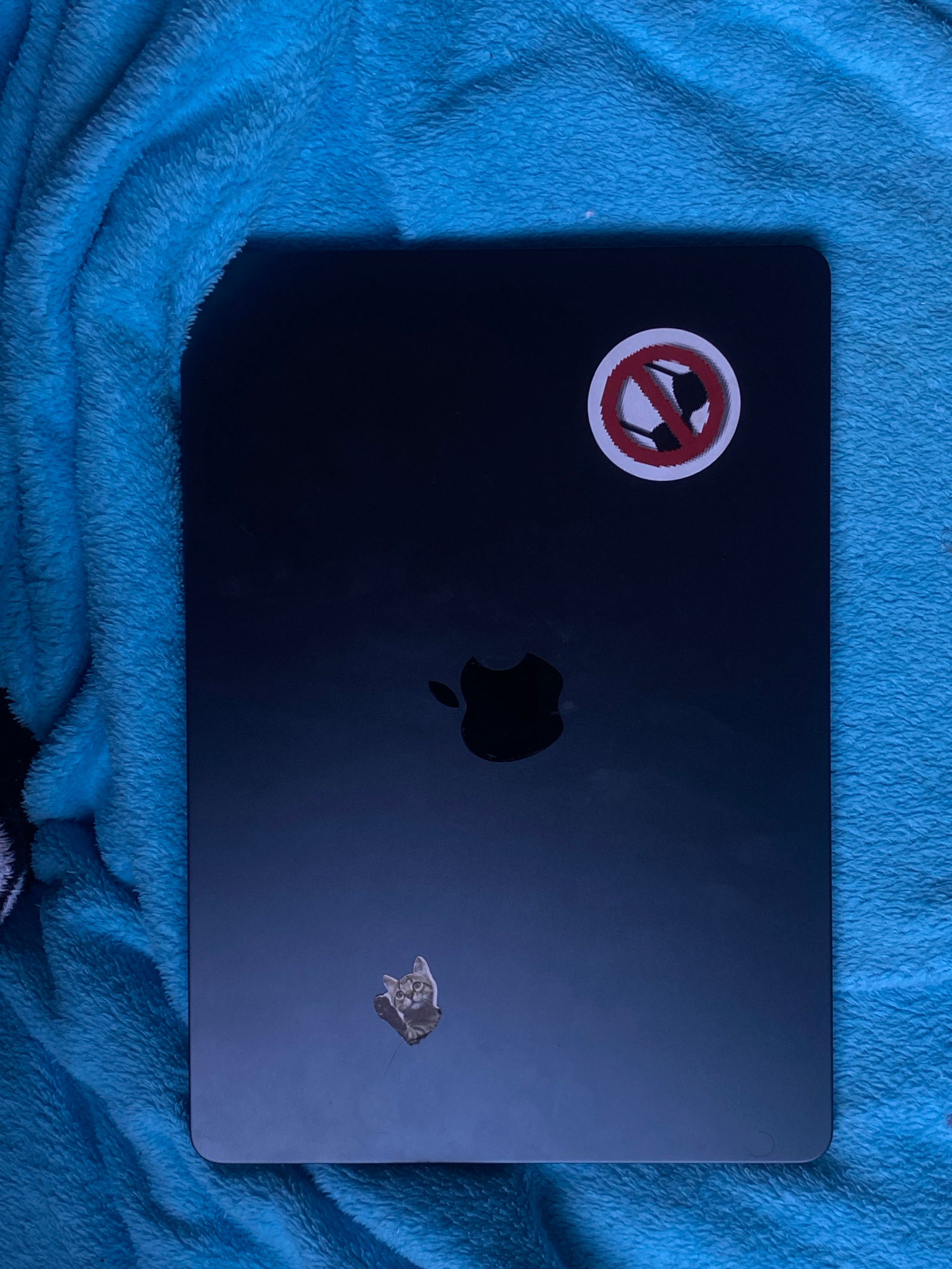 The image shows a closed, dark-colored laptop resting on a light blue, soft blanket. The laptop has two stickers on its surface: one a circular sticker with a red "no" symbol over two crossed paintbru…read more