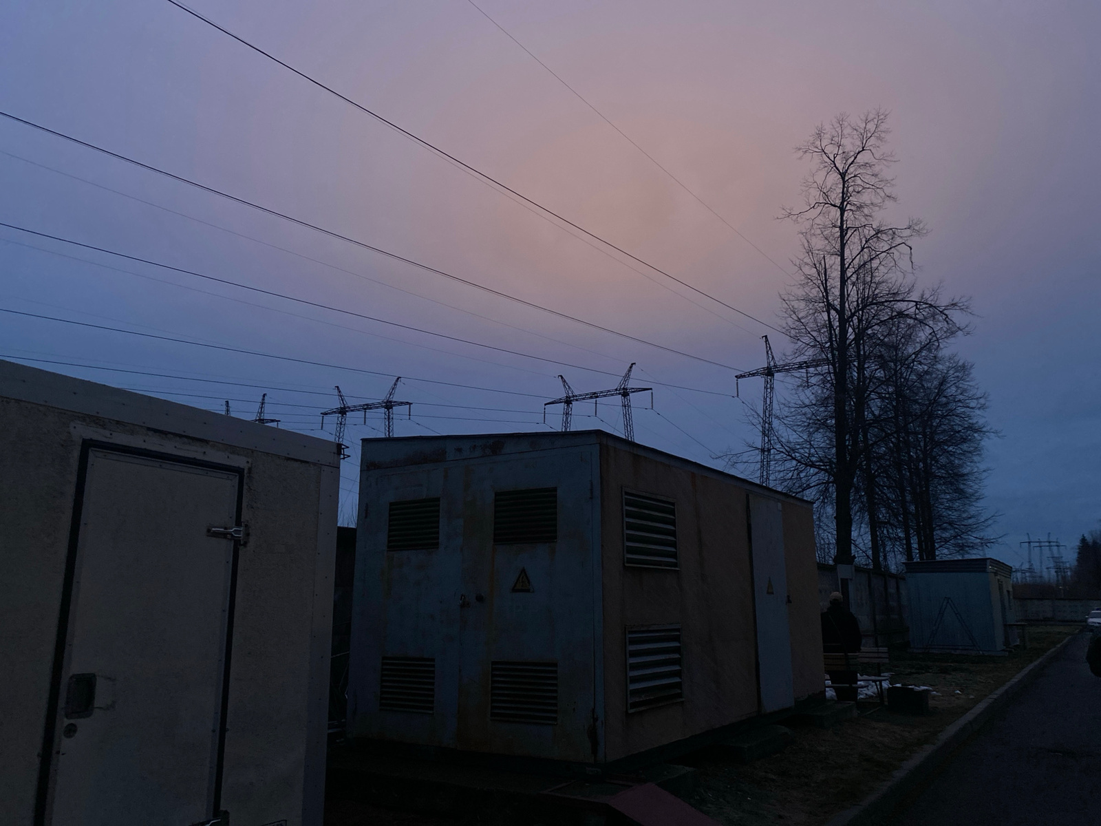 The photo presents an industrial landscape. Several electrical substations stand adjacent to a road. Power lines run overhead, connected to distant pylons. Deciduous trees, devoid of leaves, stand to…read more