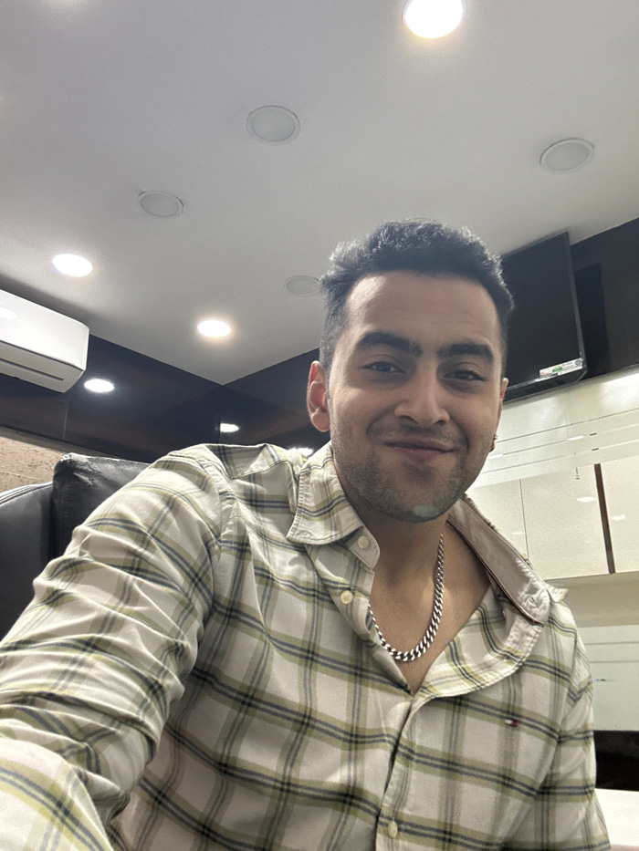 A man with dark hair and a slight smile wears a plaid shirt and a silver chain. He's positioned at an angle, facing the camera. The setting appears to be indoors, with a ceiling featuring multiple rec…read more