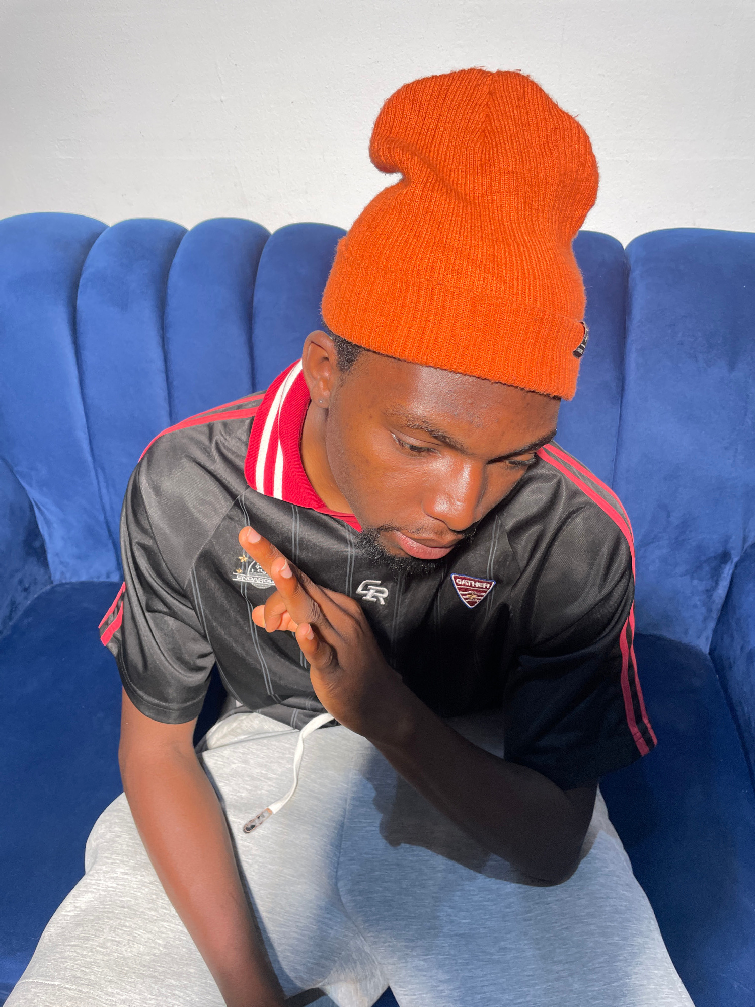 A young Black man is seated on a blue couch. He is wearing an orange beanie, a black shirt with red stripes on the sleeves, and gray sweatpants. He is making a hand gesture. The location is not identi…read more