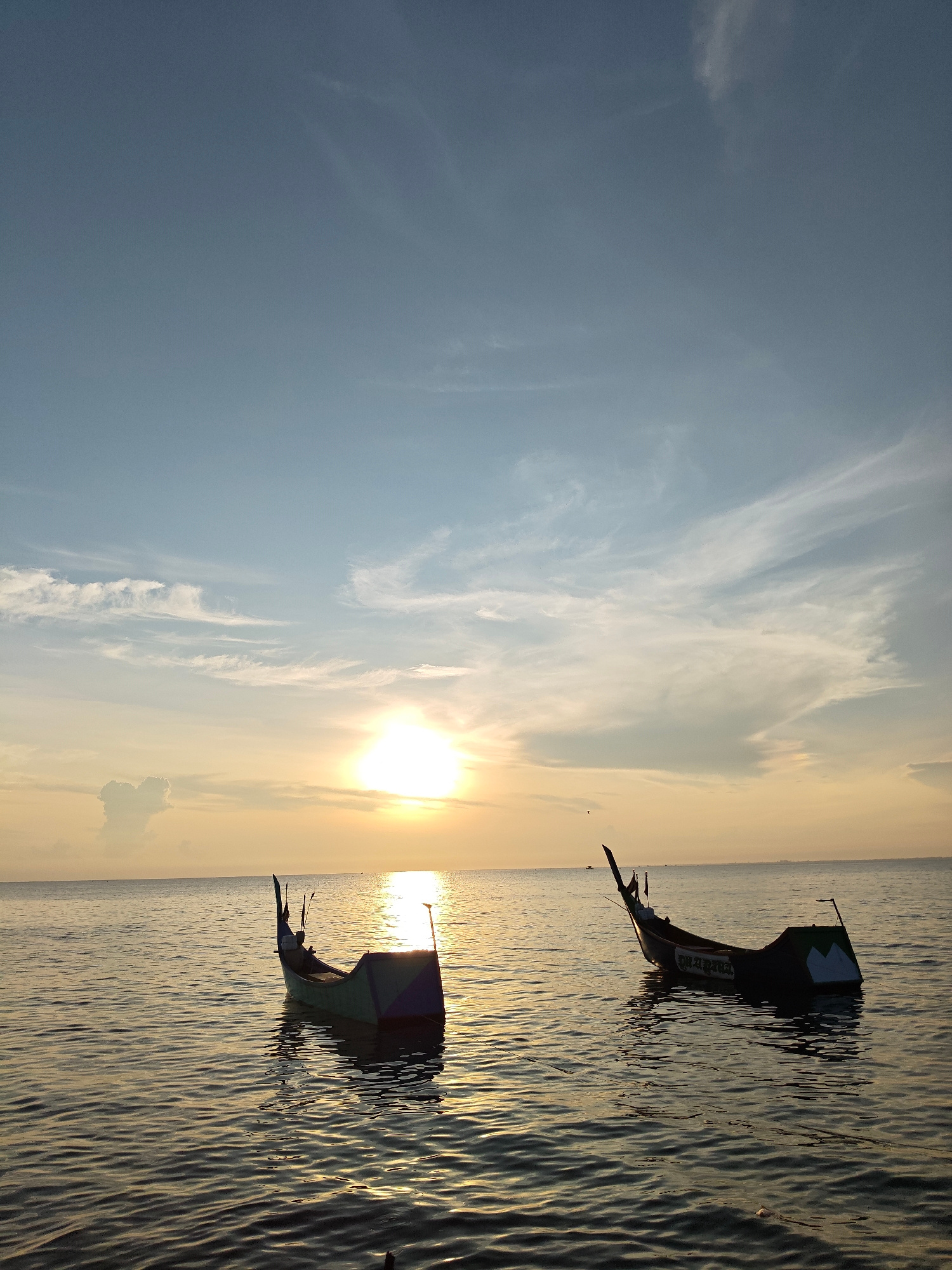 The image depicts two boats on the water at sunset in Lhokseumawe, Indonesia. The sky is predominantly blue with streaks of white clouds, transitioning to a golden hue near the horizon where the sun i…read more