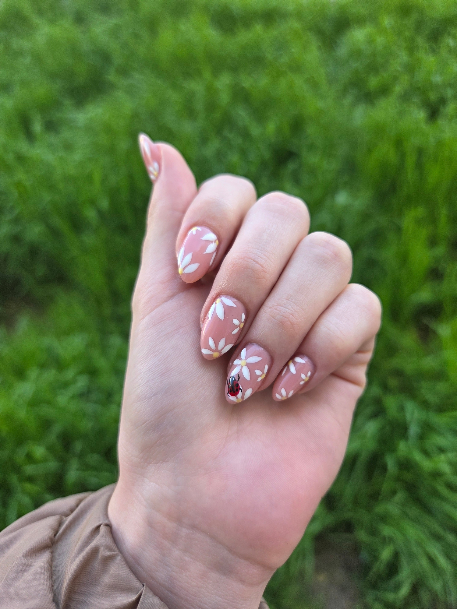 A hand with manicured nails is prominently featured against a blurred green background, likely grass or foliage, suggesting an outdoor setting. The hand is positioned with the palm facing slightly upw…read more