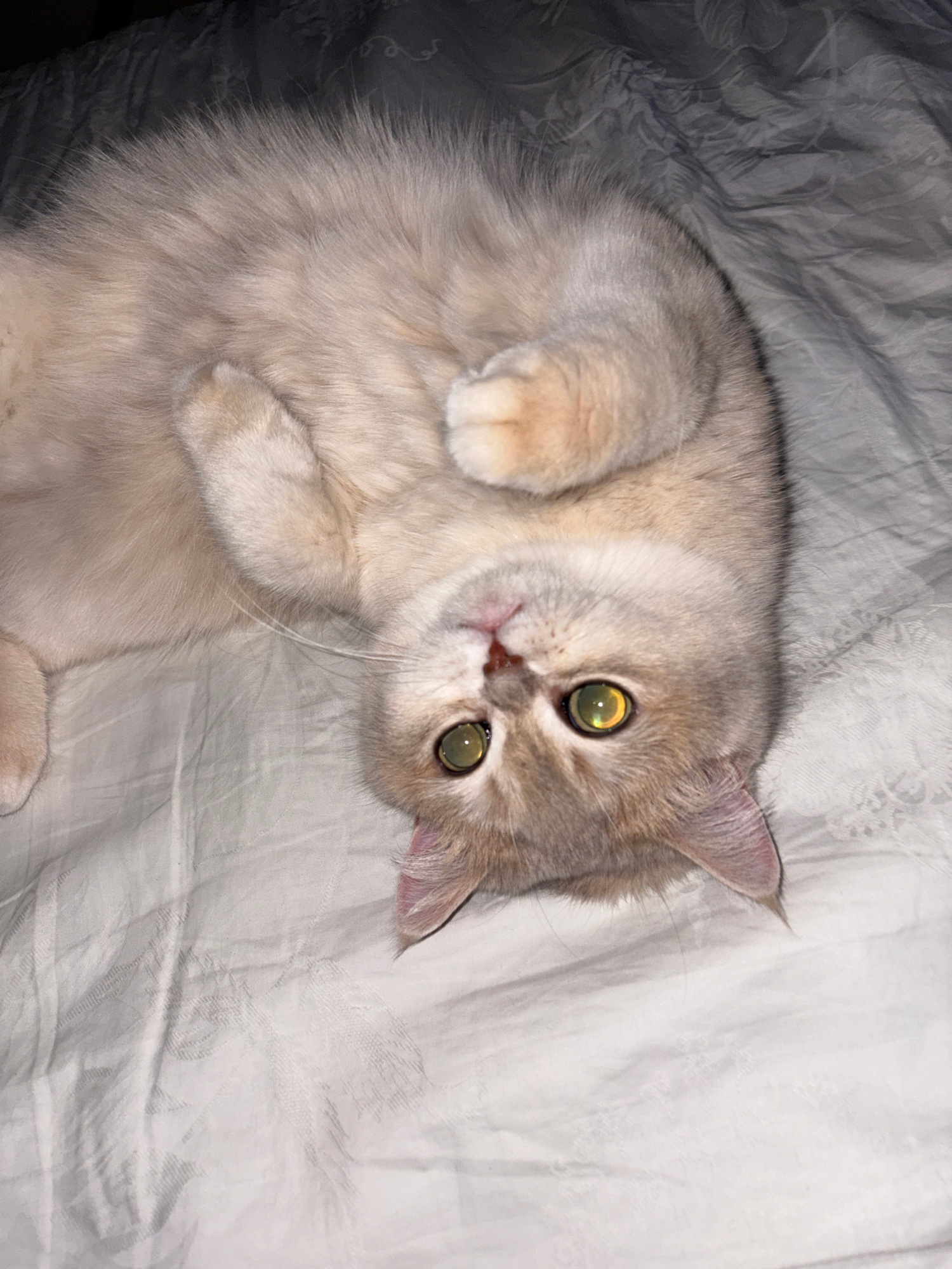 An adorable cat, likely a British Shorthair or a similar breed with a chinchilla/silver shaded coat, is depicted lying on its back on a bed or soft surface. The cat's body is positioned diagonally acr…read more