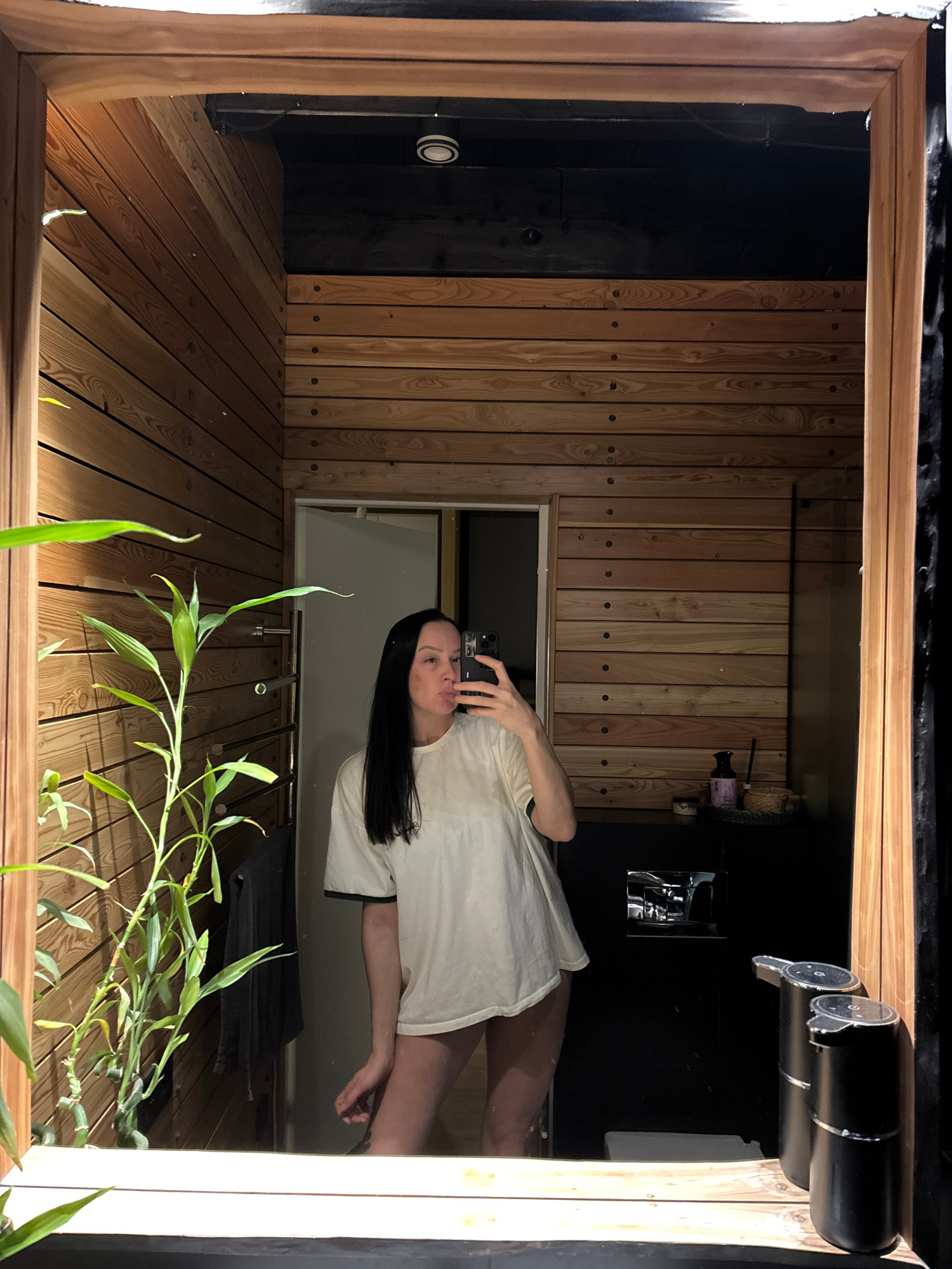 A mirror reflects a woman in a white shirt holding a smartphone, likely taking a selfie. The background shows a bathroom or sauna-like space with wooden paneling, both vertically and horizontally. Par…read more