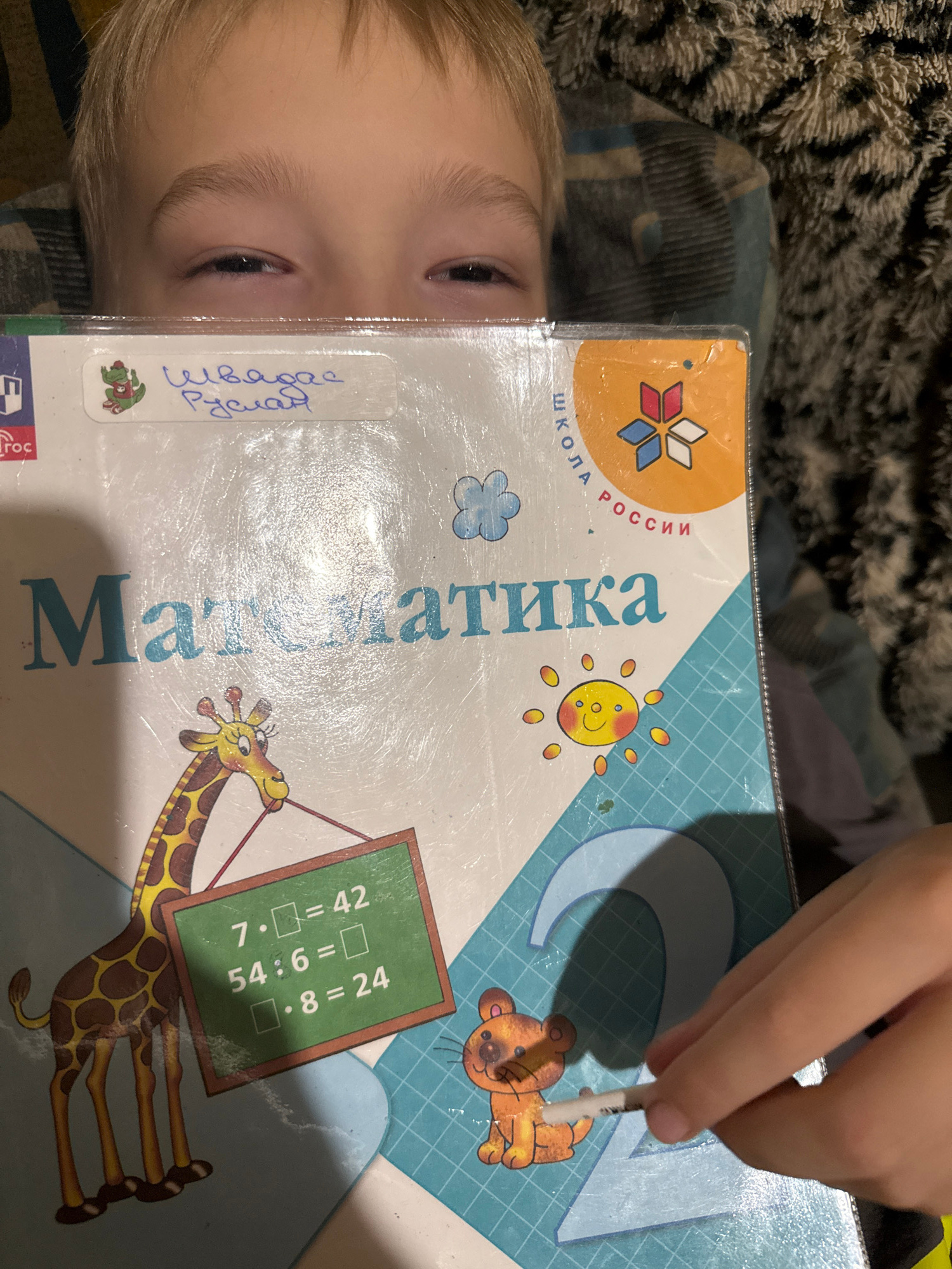 An eye-level indoor shot captures a child partially hidden behind a Russian mathematics textbook. The child's face, primarily their eyes and forehead, is visible peeking from behind the book, which co…read more