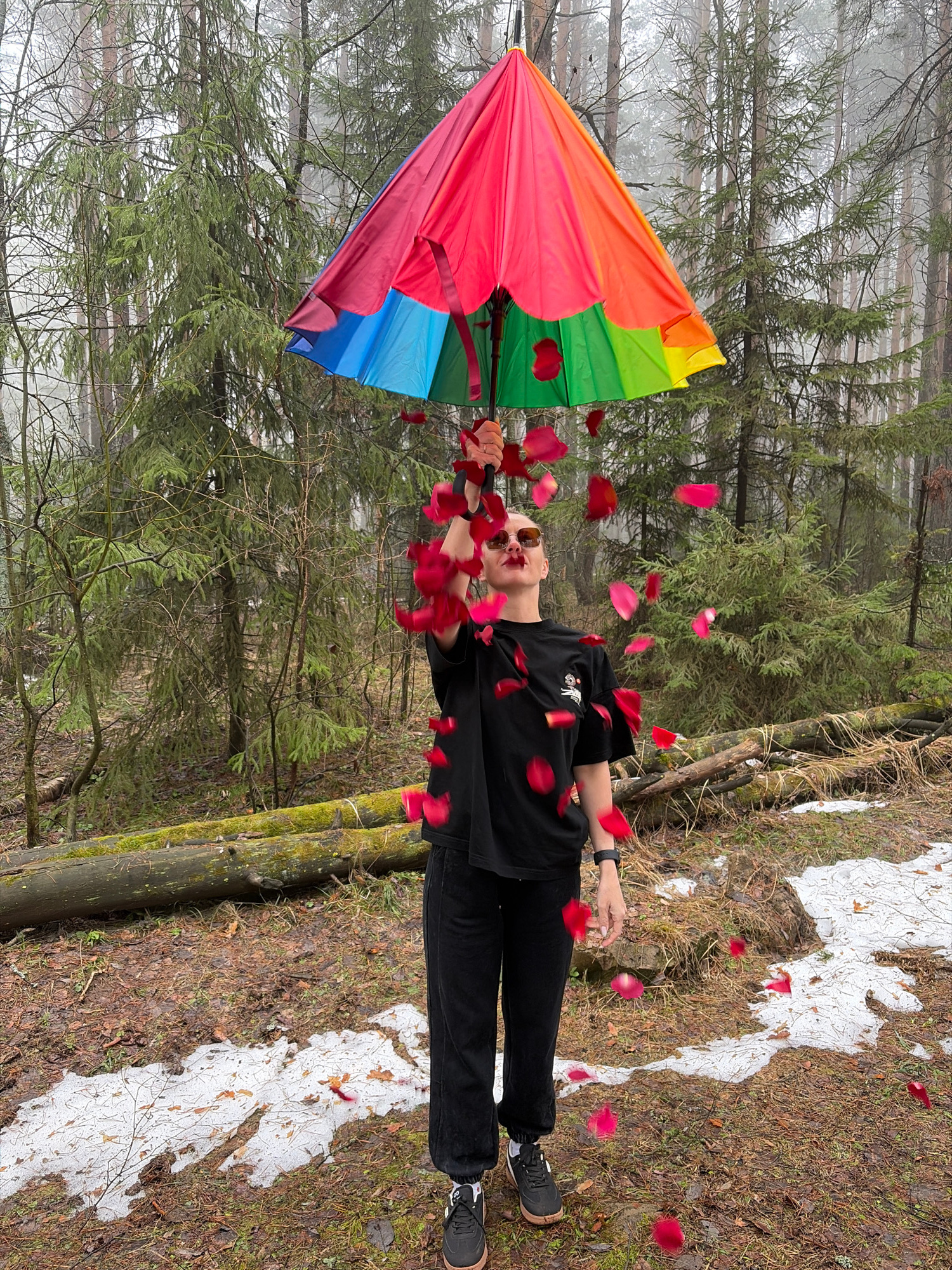A person in black clothing and sunglasses is in a forest with an open, multi-colored umbrella. Red flower petals are scattered around the person. The ground is covered with brown leaves, green vegetat…read more