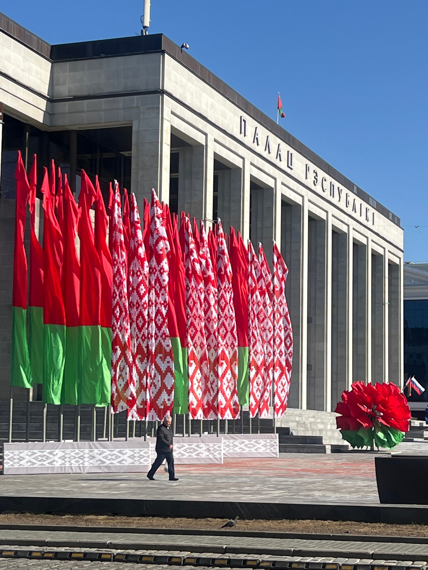 Here is a detailed description of the image: The image shows the facade of the Palace of the Republic, a government building located in Minsk, Belarus. The building is a large, rectangular structure…read more