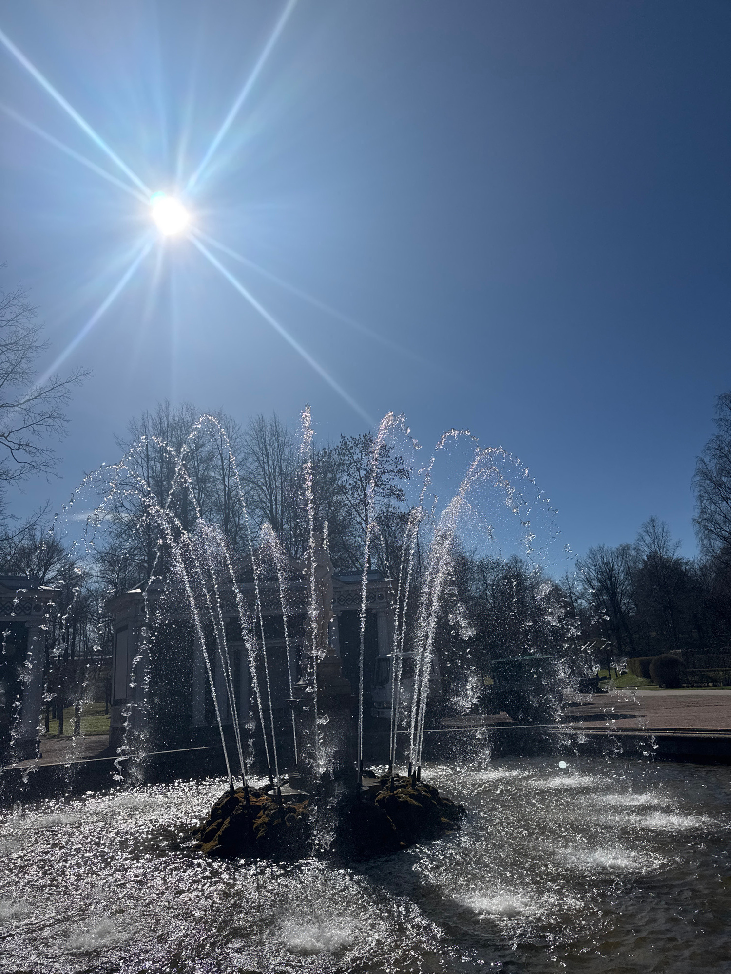 The image captures an outdoor scene at Peterhof, Russia, featuring a grand fountain under a clear, bright blue sky. The photograph is taken in a way that emphasizes the dramatic effect of the sun andβ¦read more