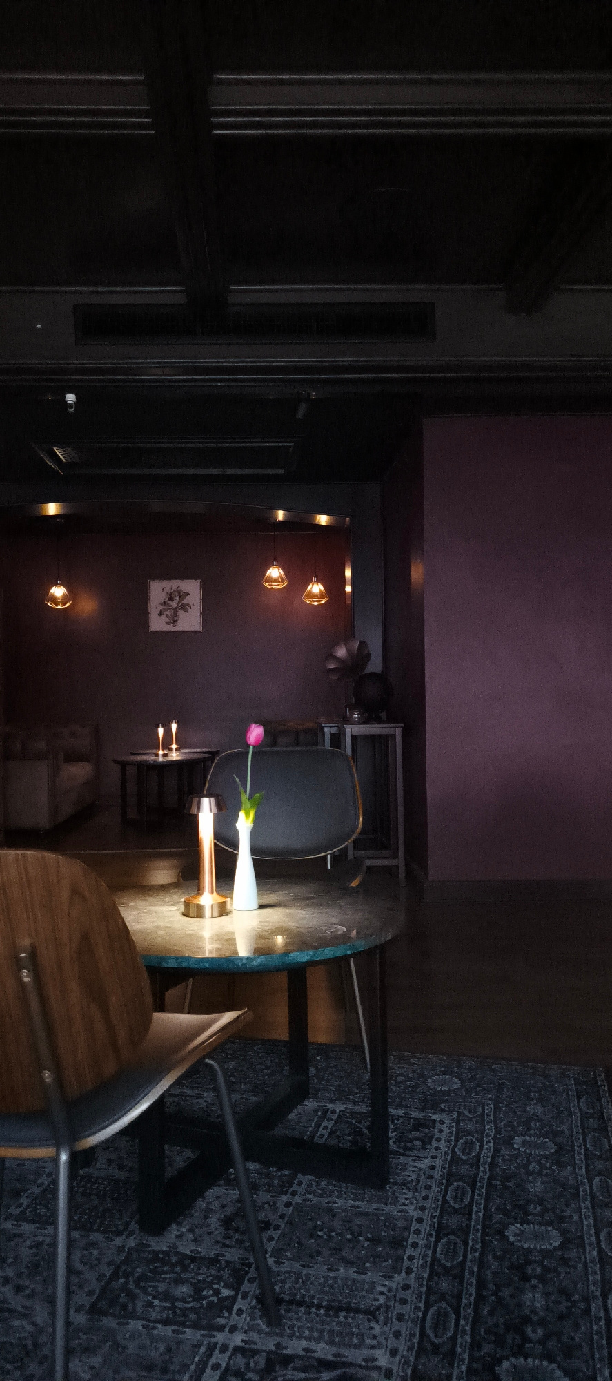 The image captures the interior of a dimly lit, stylish bar, lounge, or cafe, creating an intimate and cozy atmosphere. The scene is devoid of people. In the immediate foreground, a round table withβ¦read more