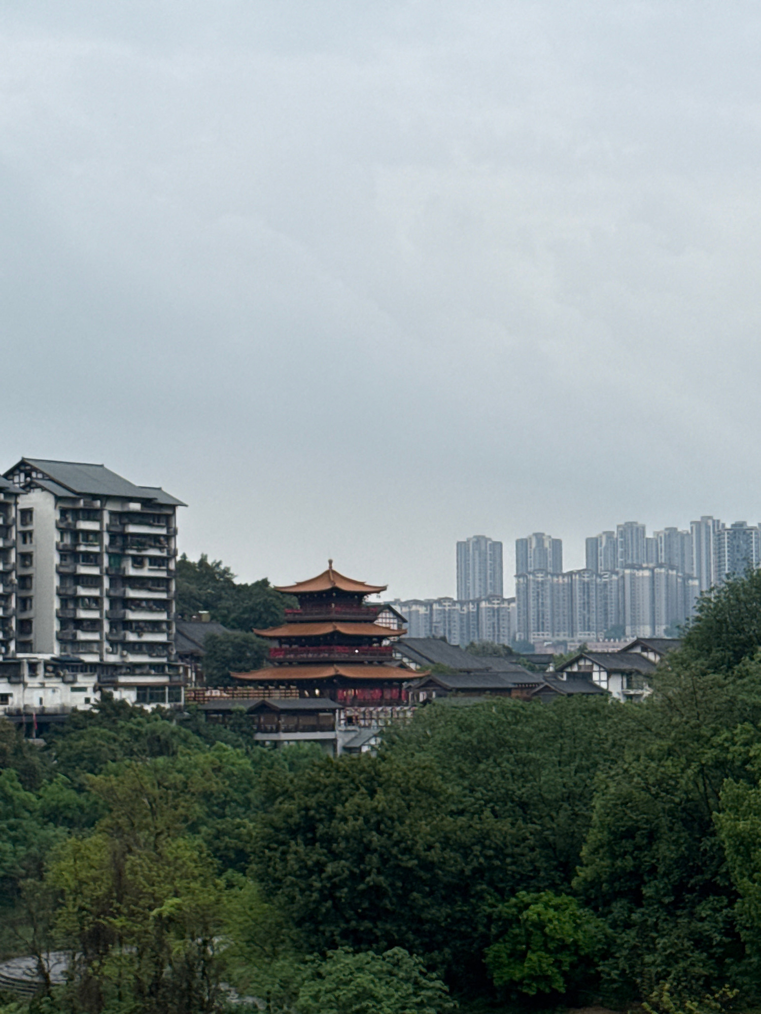 The image depicts a view of Shapingba District, China, showcasing a mix of modern and traditional architecture. High-rise apartment buildings line the horizon under an overcast sky. A traditional-styl…read more