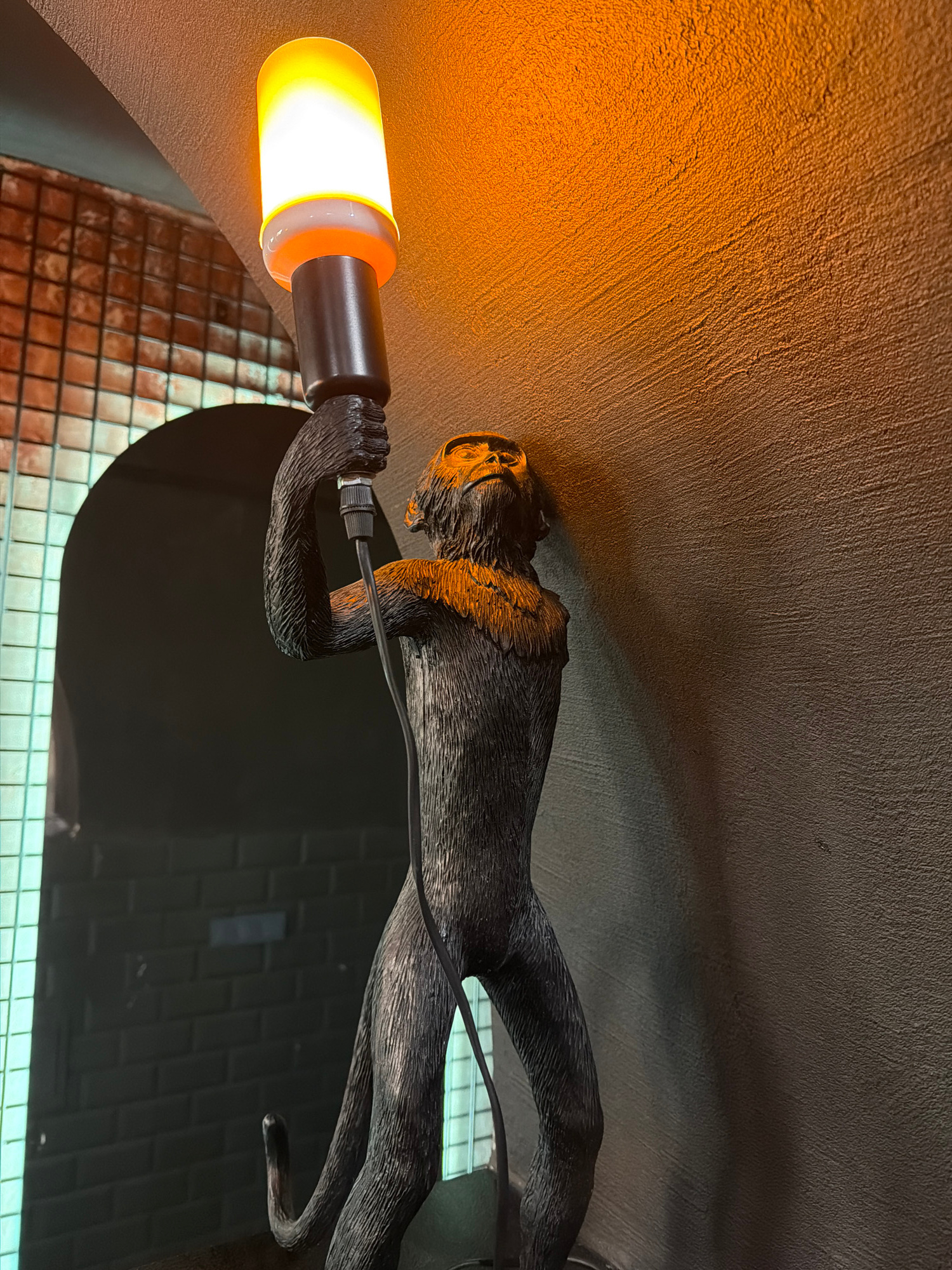 A sideways image depicts a decorative light fixture featuring a monkey statuette holding a lightbulb. The monkey is dark brown or black, with textural details suggesting it's made of wood or a similar…read more