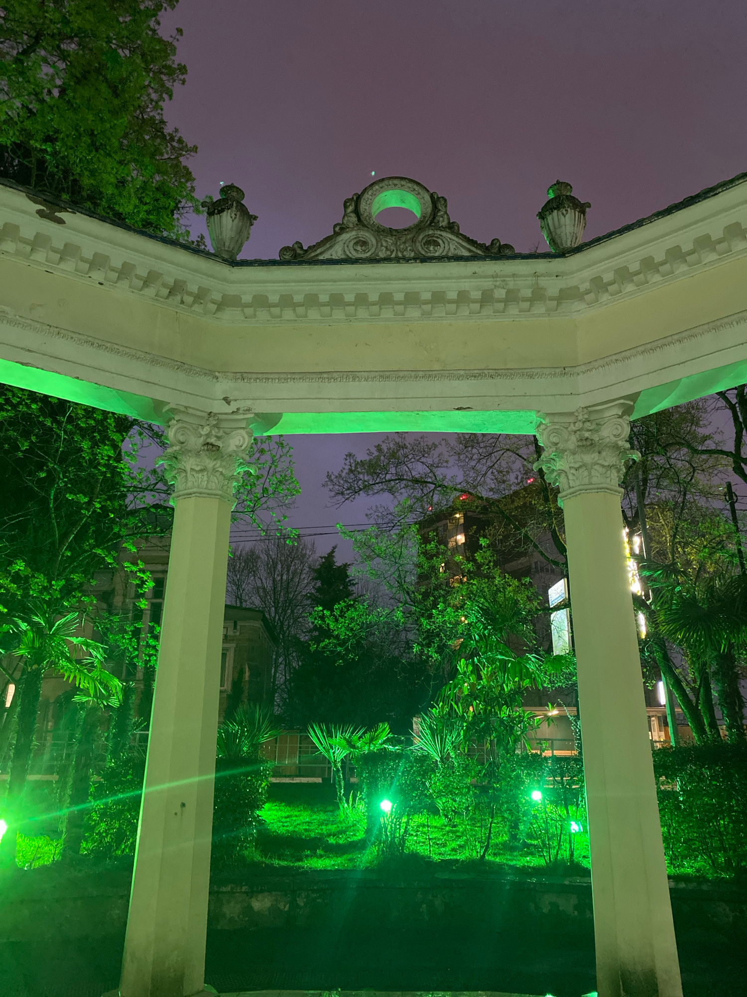 The image shows an architectural structure in Sochi, Russia. The structure is made of columns and an arch, likely located in a park or garden. The architecture is ornate, with decorative carvings. The…read more