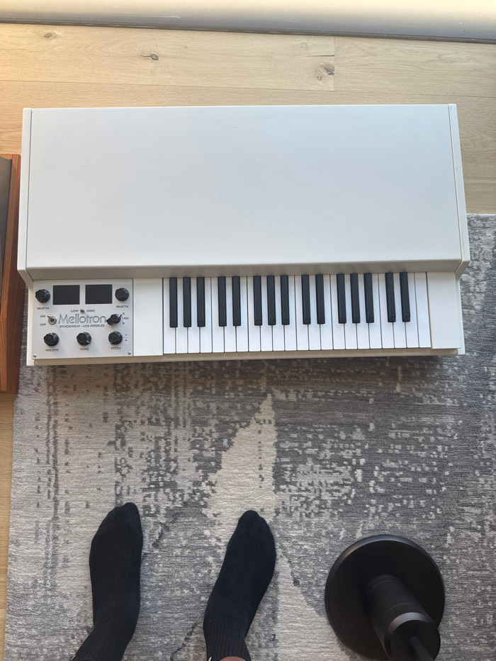 An overhead shot depicts an indoor setting. The primary subject is a white Mellotron, an electronic keyboard instrument, positioned centrally. Its front panel features a 37-key keyboard with 22 white…read more