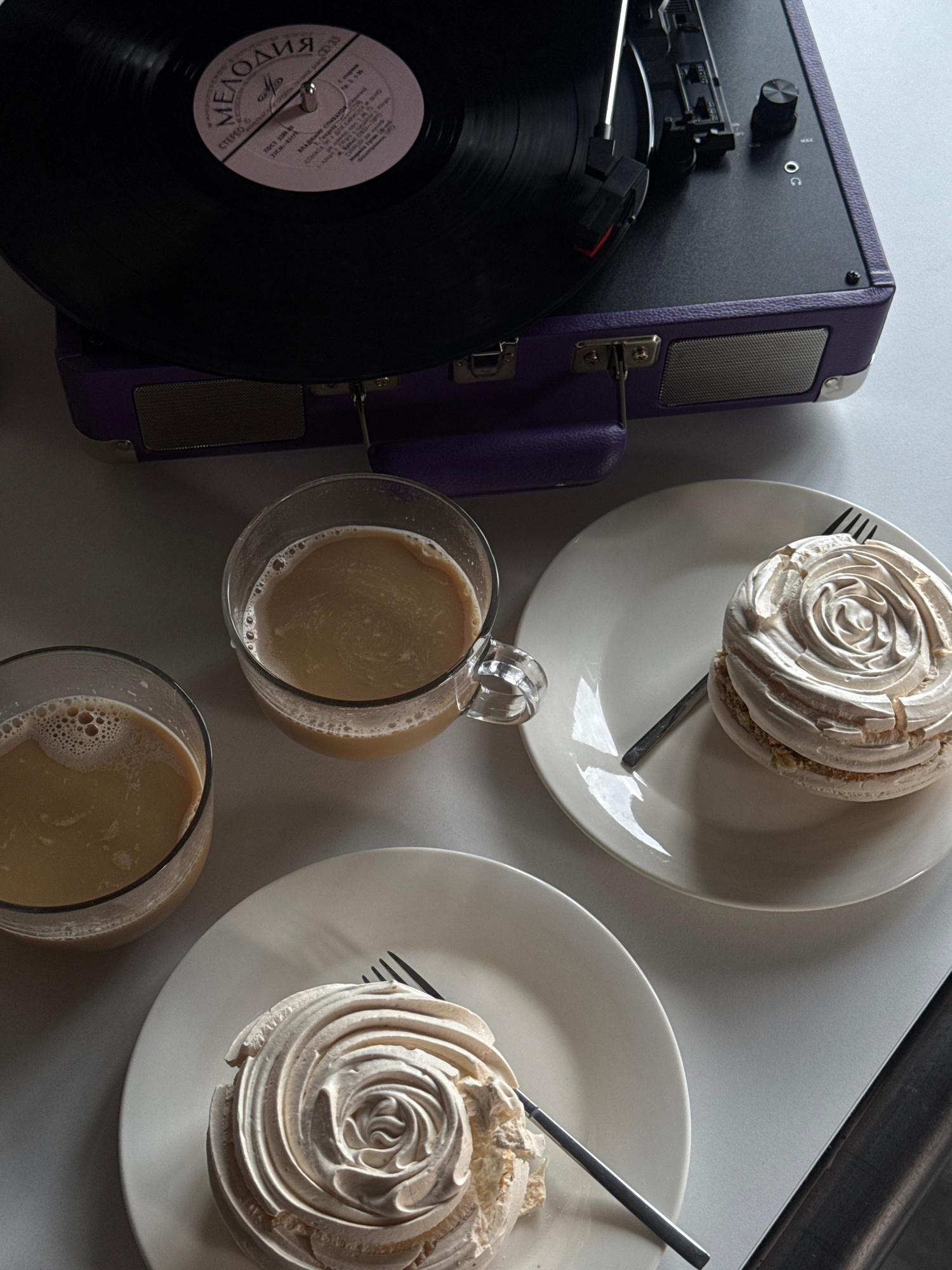 A top-down, high-angle shot presents a scene with a vintage-style turntable and two plates of dessert alongside two glasses of coffee. The turntable, primarily black with purple trim, is located on th…read more