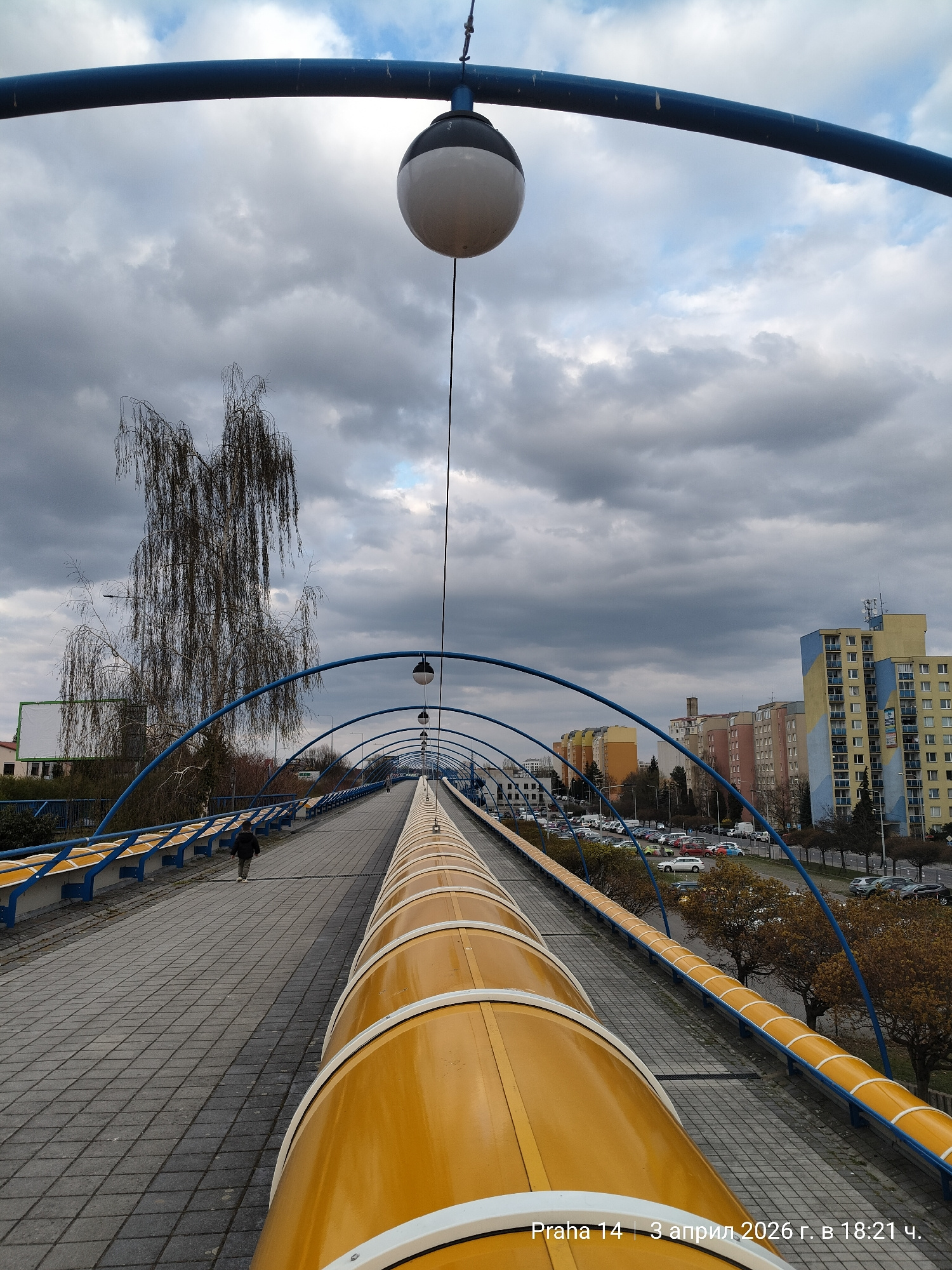 A pedestrian bridge in Prague 14, Czechia, is captured on an overcast day. The bridge features blue arched supports with hanging spherical lights. A yellow, cylindrical structure runs along the center…read more