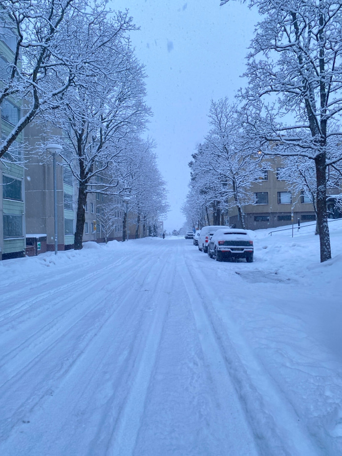A winter street scene features a snow-covered road with tire tracks. Parked cars are lined along one side of the street, also covered in snow. Bare trees, heavily laden with snow, frame the view on ei…read more