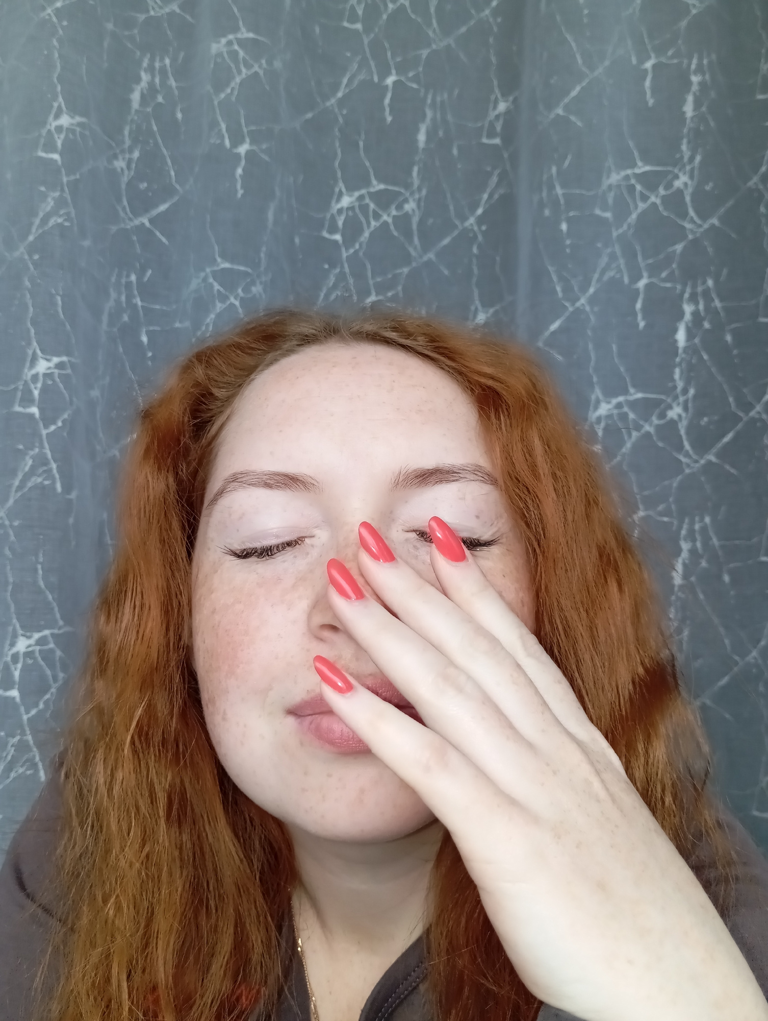 A person with red hair and freckles is lying down on a grey surface with a marble-like pattern. Their eyes are closed, and their hand is covering their face. The person is wearing red nail polish. Theβ¦read more