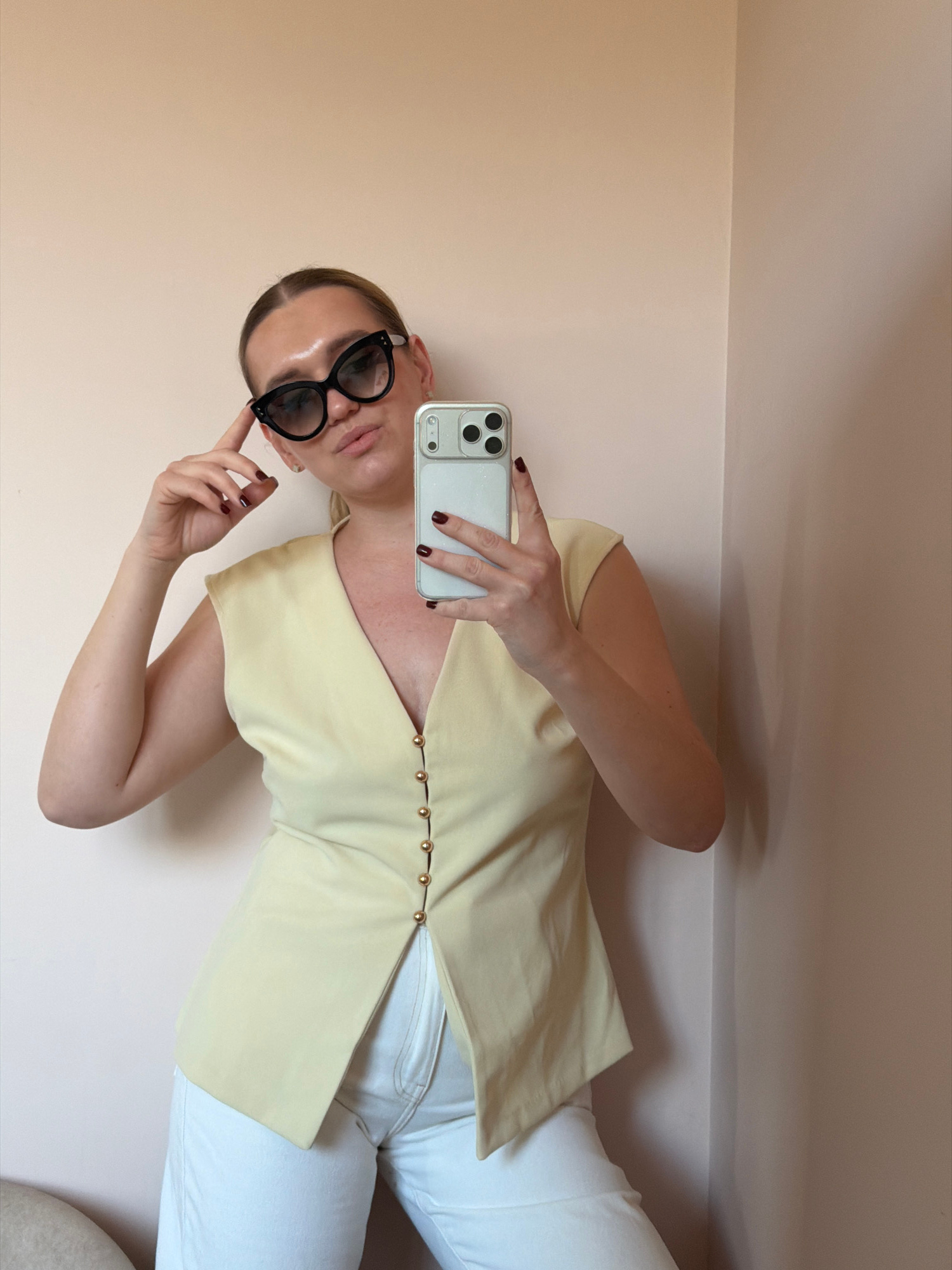 A woman takes a selfie indoors. She is wearing white jeans, a pale yellow top with small gold buttons down the front, and black sunglasses. She is holding a smartphone with a clear case. The walls are…read more